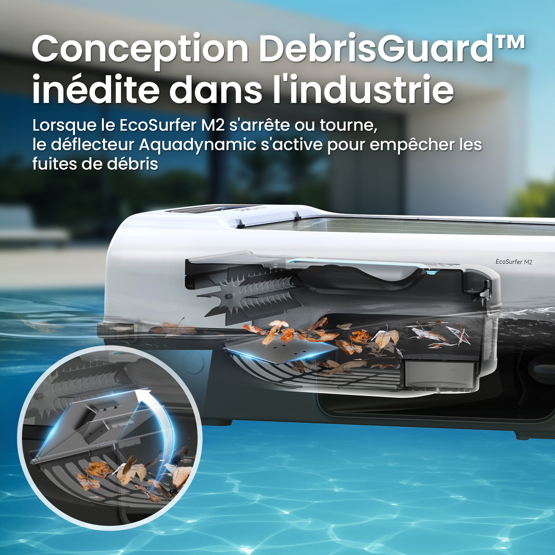 Lorsque le EcoSurfer M2 s’arrête ou change de direction, le déflecteur DebrisGuard™ aquadynamique entre en action et se ferme automatiquement pour empêcher toute fuite de débris. Grâce à cette fonction innovante, vous profitez d’un fonctionnement sans faille.