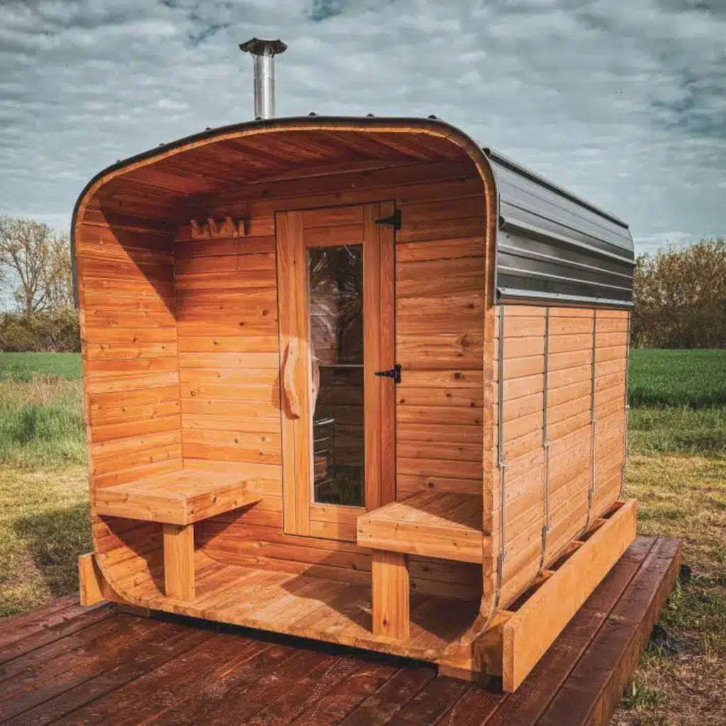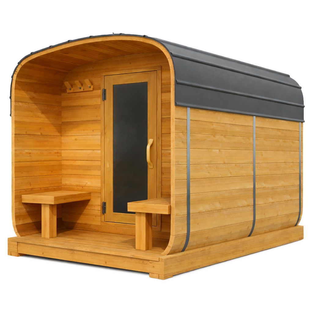 Profitez d’un espace de détente chaleureux et authentique grâce à ce sauna cube conçu en cèdre rouge de l’Ouest canadien 100 % naturel. Reconnue pour sa durabilité, sa beauté naturelle et ses excellentes propriétés thermiques, cette essence de bois contribue à créer une atmosphère enveloppante et confortable, idéale pour vos moments de relaxation. Le porche intégré à l’avant ajoute un espace pratique et convivial pour faire une pause entre les séances.