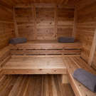 L'intérieur du sauna est équipé de bancs confortables en mélange de bois de cèdre et de pin, qui offrent une assise optimale pour profiter de la chaleur. La porte vitrée permet de voir l'intérieur du sauna tout en gardant la chaleur à l'intérieur.