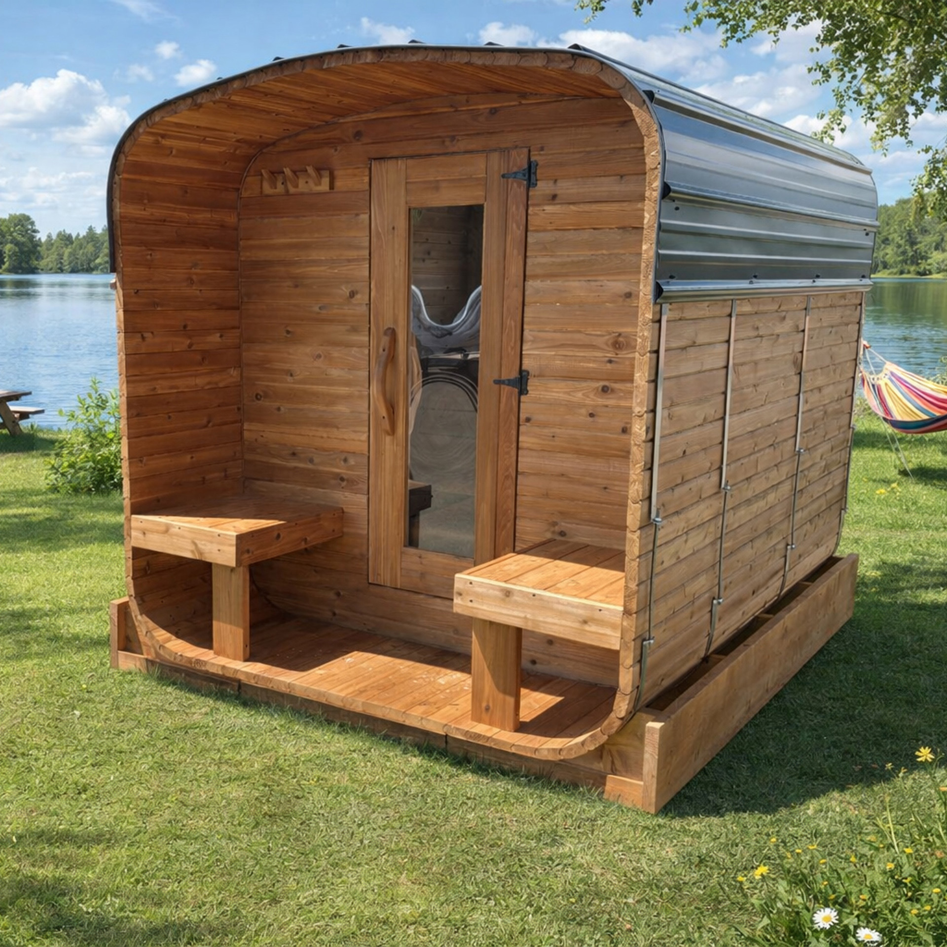 Sa structure robuste est solidement maintenue par des bandes en acier inoxydable disposées autour du sauna, assurant une stabilité durable au fil des saisons. La base de soutien en pin blanc massif procure une fondation fiable et résistante, tandis que le toit recouvert d’une membrane et d’une tôle noire contribue à une meilleure protection contre les intempéries.