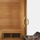 L'intérieur du sauna est équipé de bancs confortables en mélange de bois de cèdre et de pin, qui offrent une assise optimale pour profiter de la chaleur. La porte vitrée permet de voir l'intérieur du sauna tout en gardant la chaleur à l'intérieur.