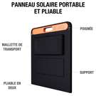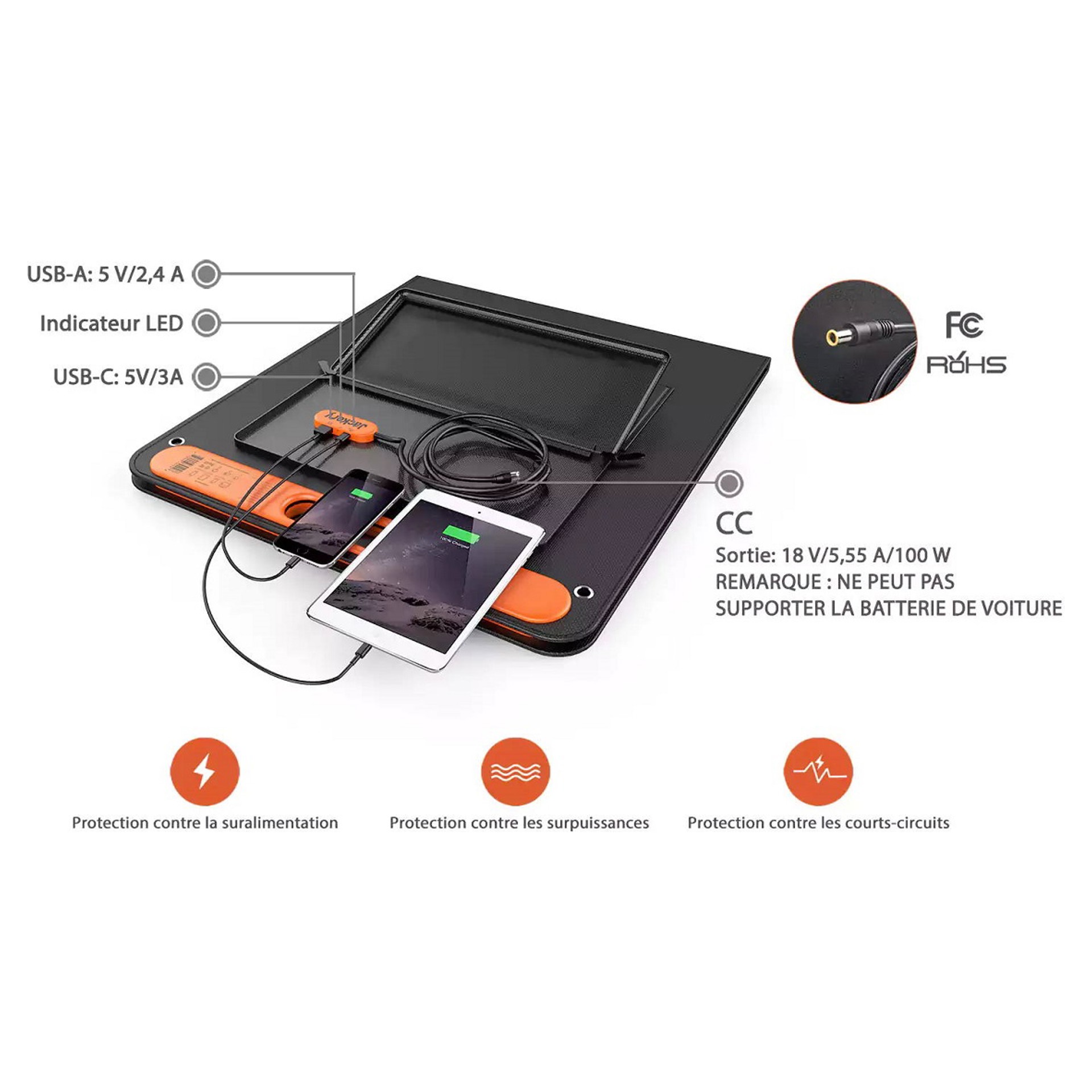 Durable et résistant aux éclaboussures : le boîtier laminé ETFE est assez durable pour prolonger la durée de vie du panneau solaire. Il est étanche IP65 qui protégera des éclaboussures d'eau (ne pas le placer sous la pluie, ni le tremper dans l'eau). Les fermetures éclair sur la poche peuvent contenir les cordons d'alimentation et couvrir le port d'alimentation.