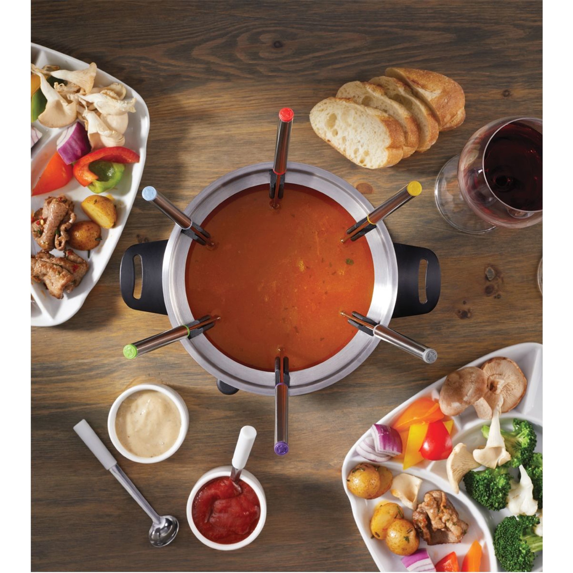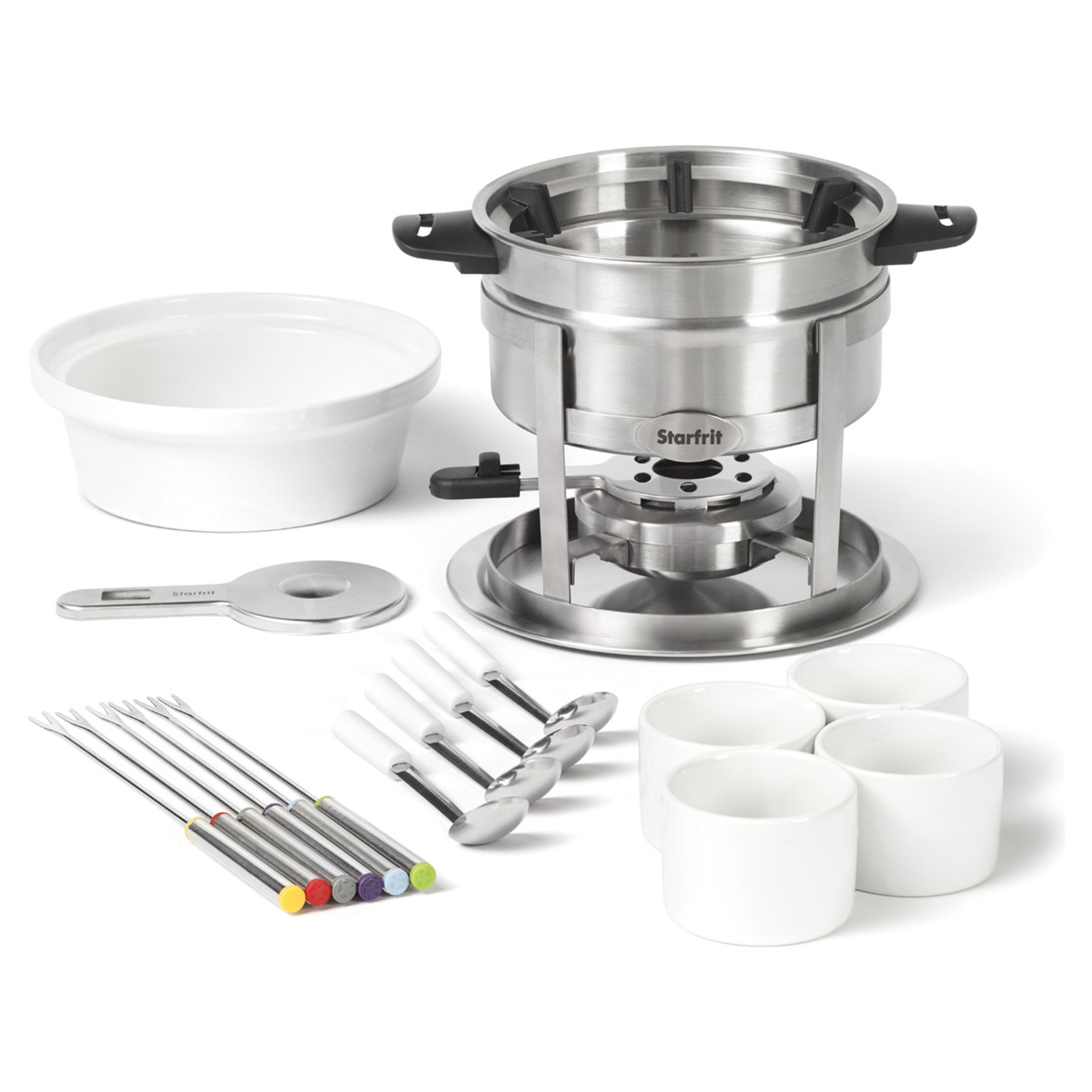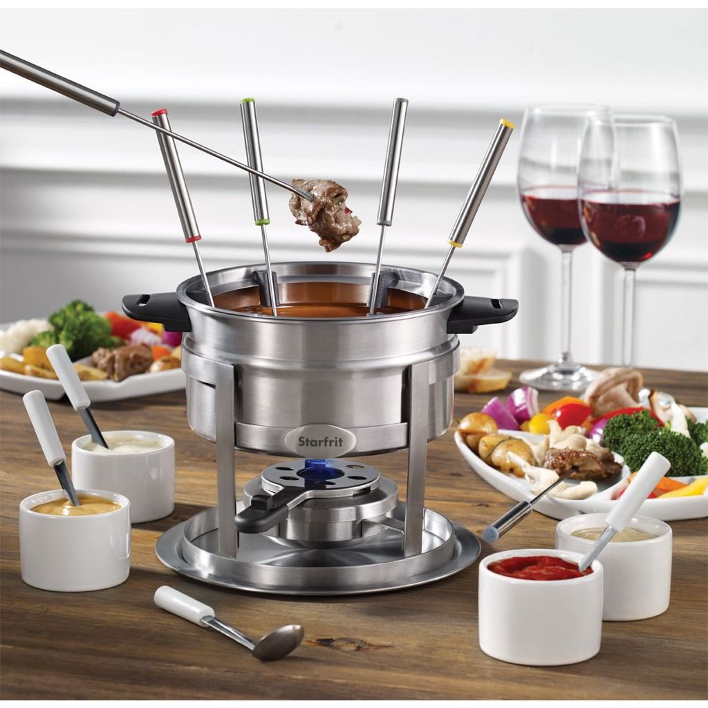 ENS A FONDUE STARFRIT 3 EN 1 AVEC SUPPORT MAGNETIQUE Parfait pour les fondues à la viande, au fromage et au chocolat • Guide à fourchettes magnétique permet d'éviter l'entremêlement des fourchettes au centre du caquelon • Brûleur ajustable sécuritaire pour avoir contrôle sur temp. • Brûleur uniquement compatible avec combustible en gel • Caquelon compatible sur la cuisinière • Livret d'instruction et recettes inclus