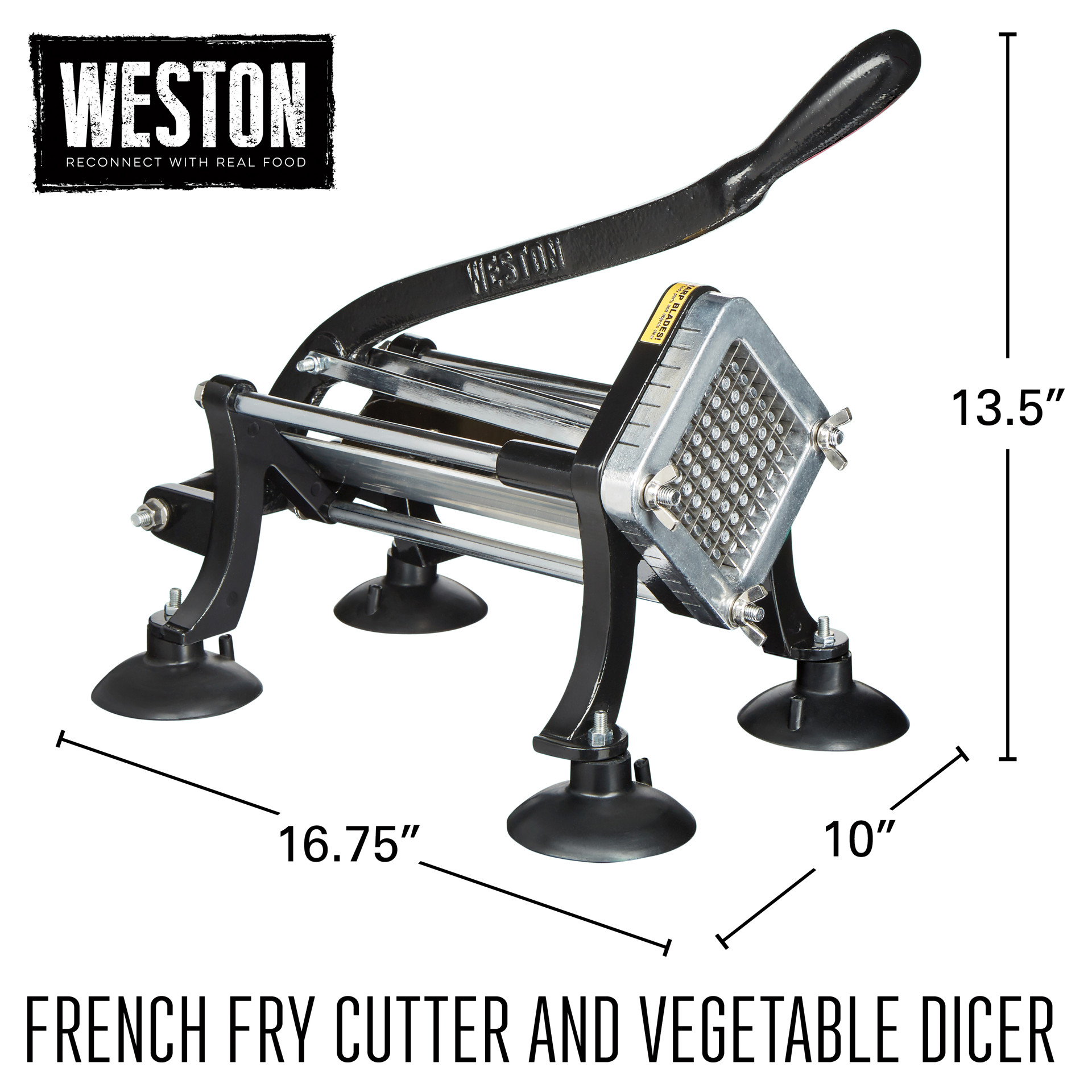 Préparez des frites comme au restaurant à la maison avec le coupe-frites et coupe-légumes professionnel Weston®. Il suffit de placer les pommes de terre dans le presse-frites et d'appuyer sur la poignée. En un seul geste, vous obtiendrez une grande quantité de frites parfaitement coupées, prêtes à cuire.