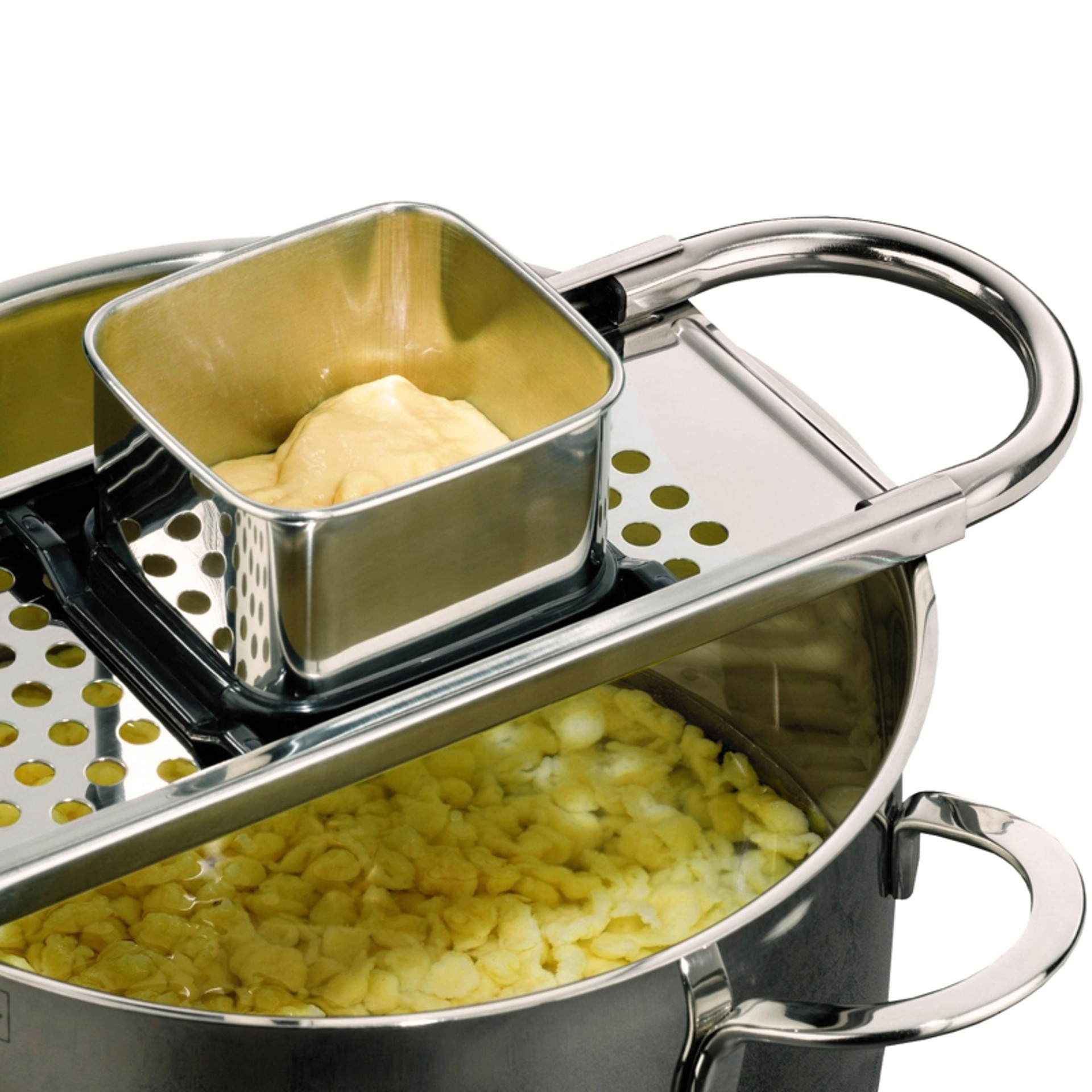 Râpe à spaetzle de 30,5 x 11,5 cm en acier inoxydable, idéale pour préparer facilement de délicieux spaetzles maison. Conçue pour simplifier la préparation, elle s’adapte aisément sur une casserole d’eau bouillante.