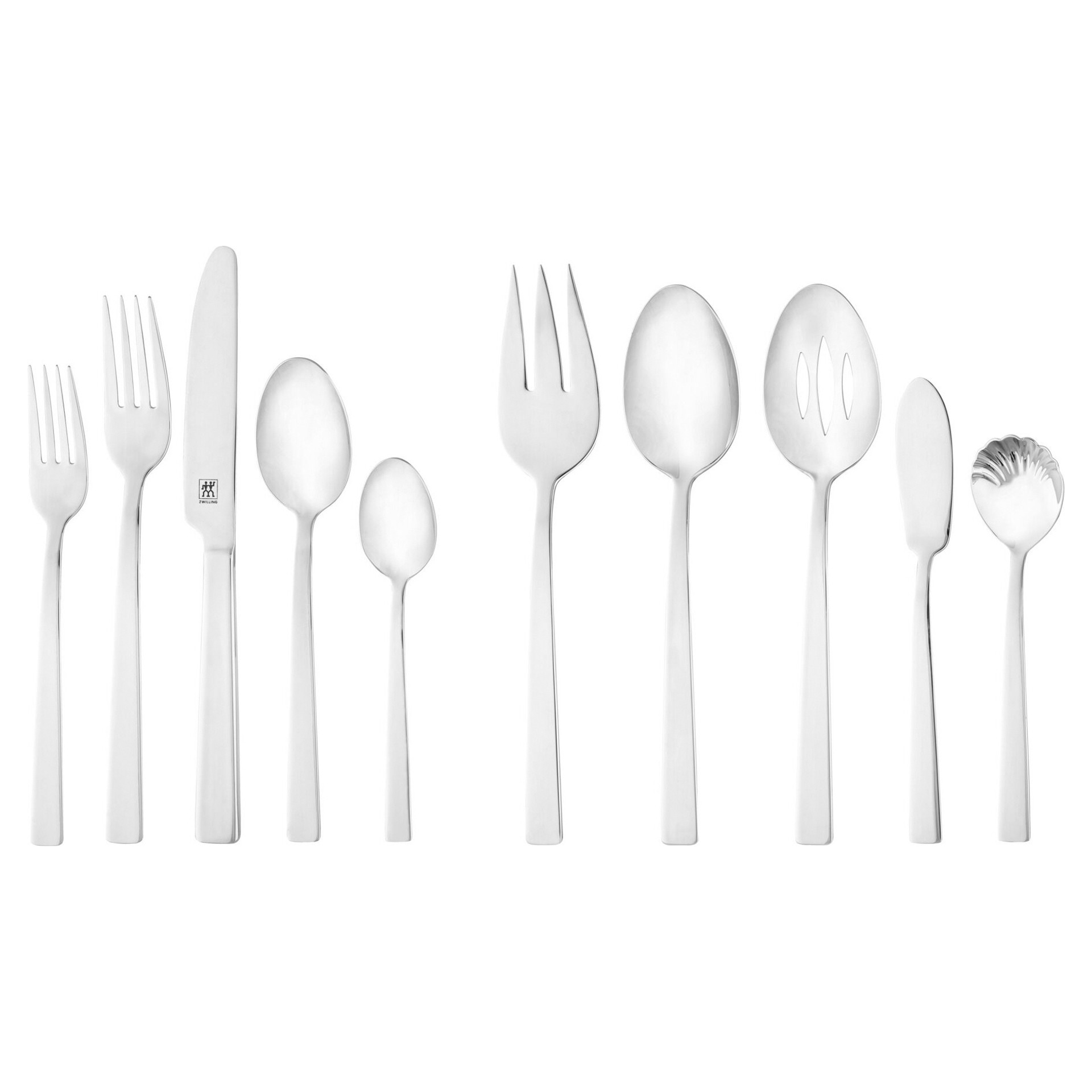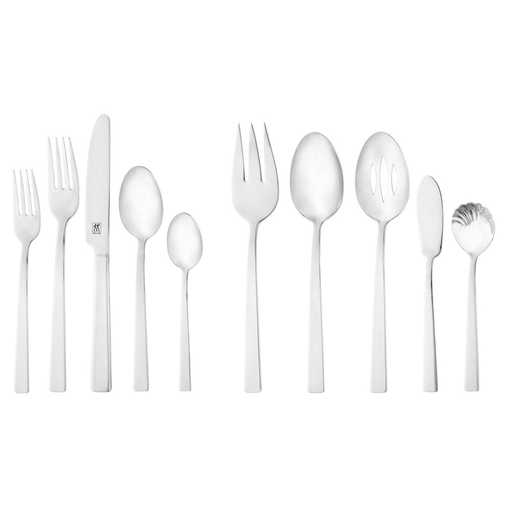 L'ensemble comprend: 12 x couteaux de table, 12 x fourchettes de table, 12 x cuillères de table, 12 x fourchettes à salade, 12 x cuillères à café, 1 x cuillère de service, 1 x cuillère de service fendue, 1 x fourchette de service, 1 x cuillère à sucre, 1 x couteau à beurre.