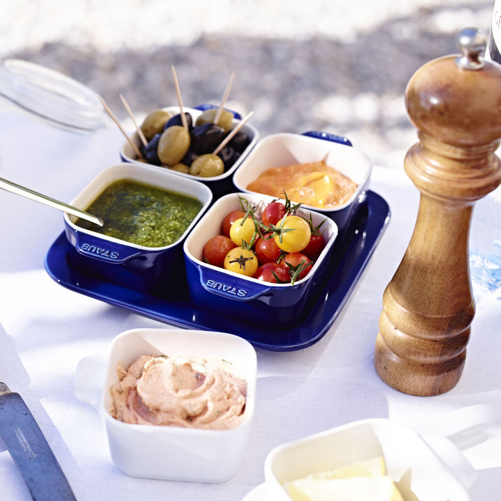 Ce service à tapas en céramique de forme carrée de Staub a été spécialement conçu pour servir de délicieuses tapas, un apéritif espagnol populaire, mais il peut également être utilisé pour les dips.