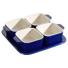 Il mesure 19 cm x 19 cm et comprend quatre ramequins rectangulaires de 8 cm et un plat de service.
