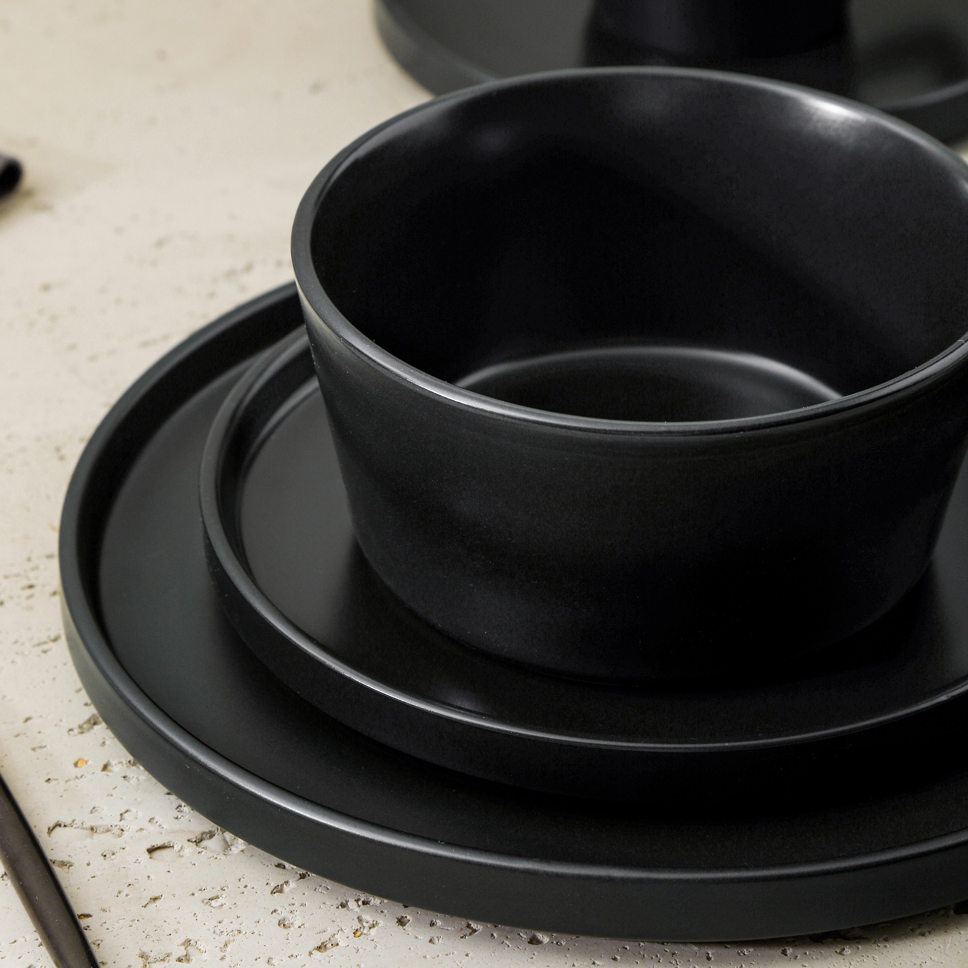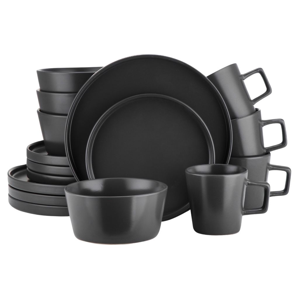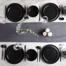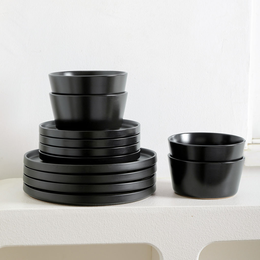 Idéal pour la cuisine, la salle à manger ou les repas en plein air, le service de table rond 16 pièces en grès noir mat Celina de Stone Lain allie à la perfection style tendance et élégance classique.