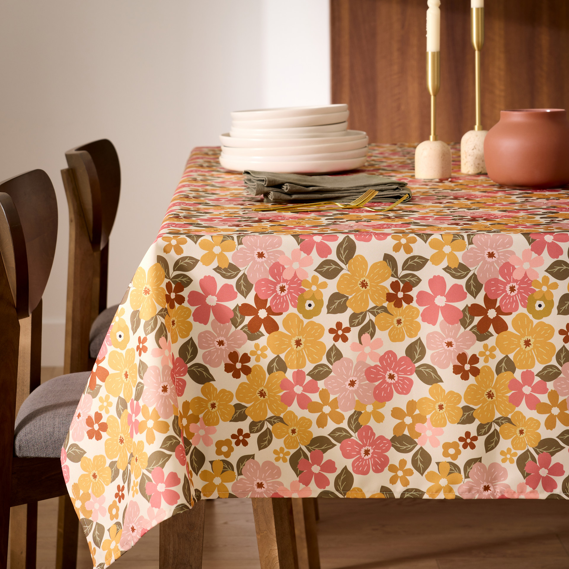 Nappe fleurie dans les teintes de jaune moutarde, de terracotta et de rose sur un fond blanc.