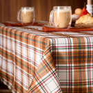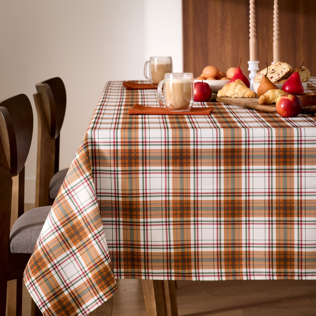 Nappe à carreaux dans les teintes de terracotta, de vert et de blanc.