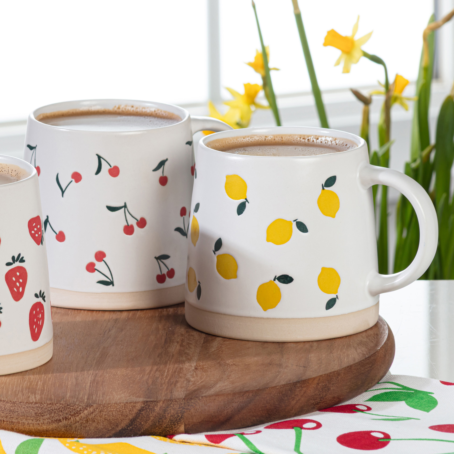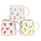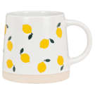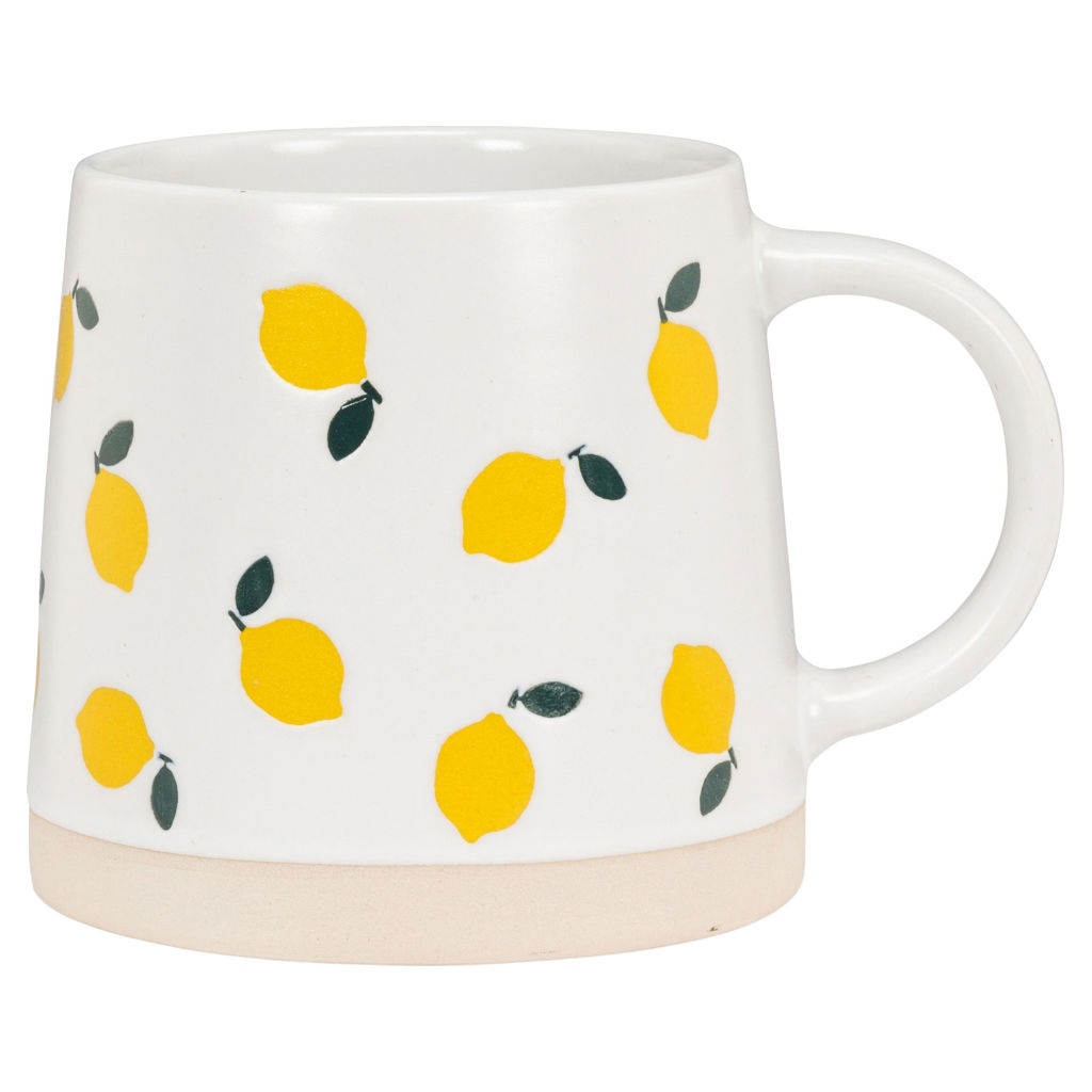 Cette tasse en grès à base large présente une dispersion ludique de citrons - parfaite pour ceux qui aiment leur café avec un accompagnement d'agrumes.