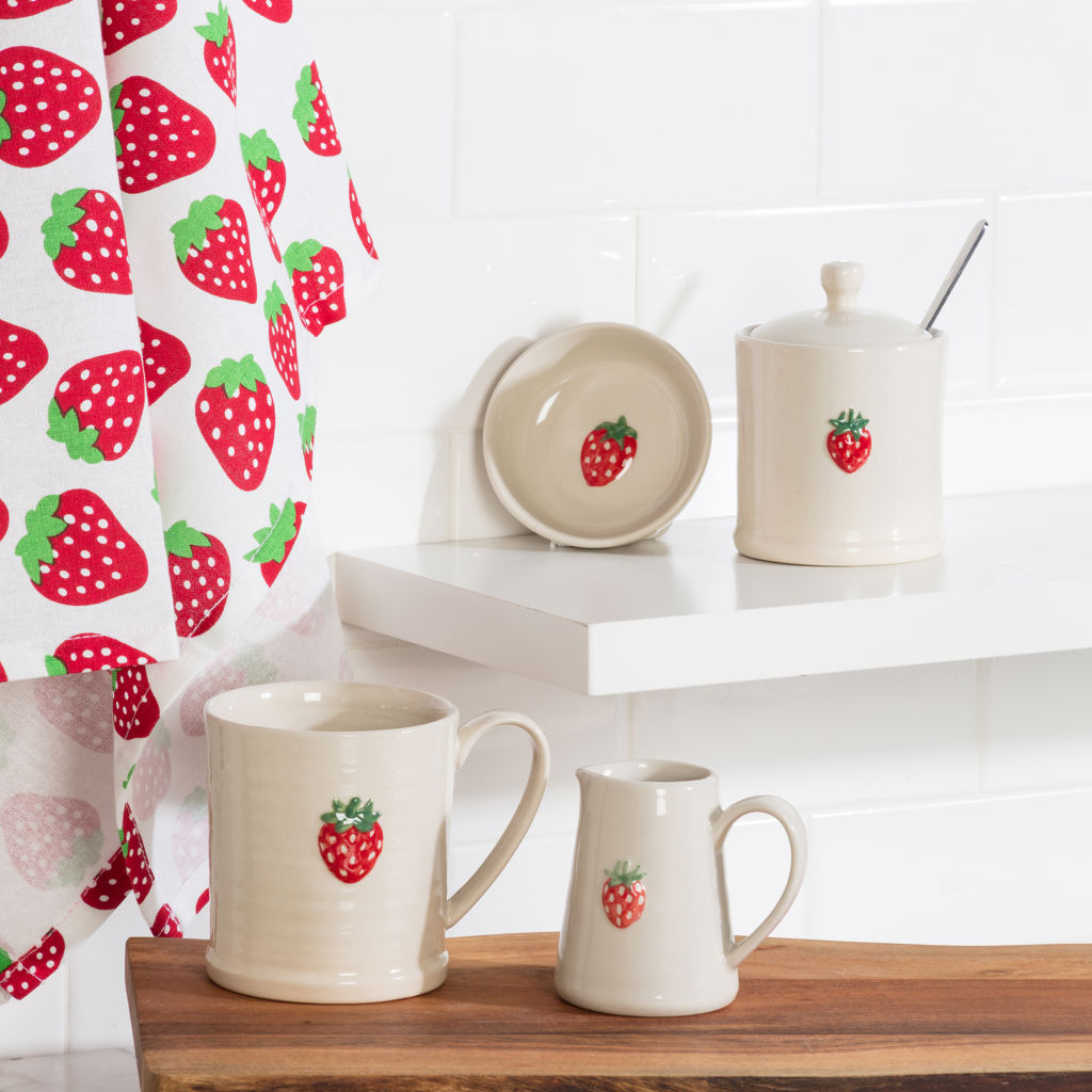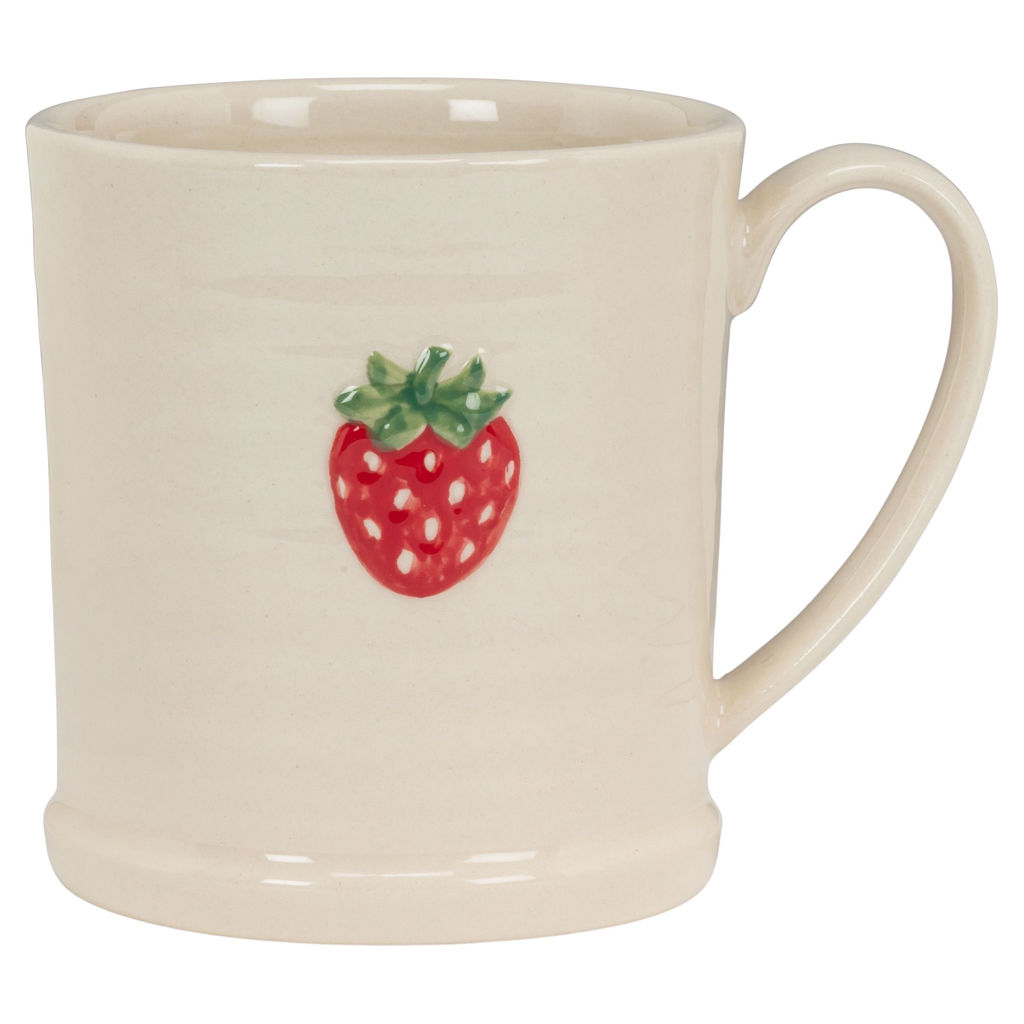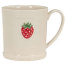 Cette tasse cerclée classique de 12 oz, fabriquée en grès durable, comporte un seul motif de fraise peint à la main qui est aussi citronné que rafraîchissant.