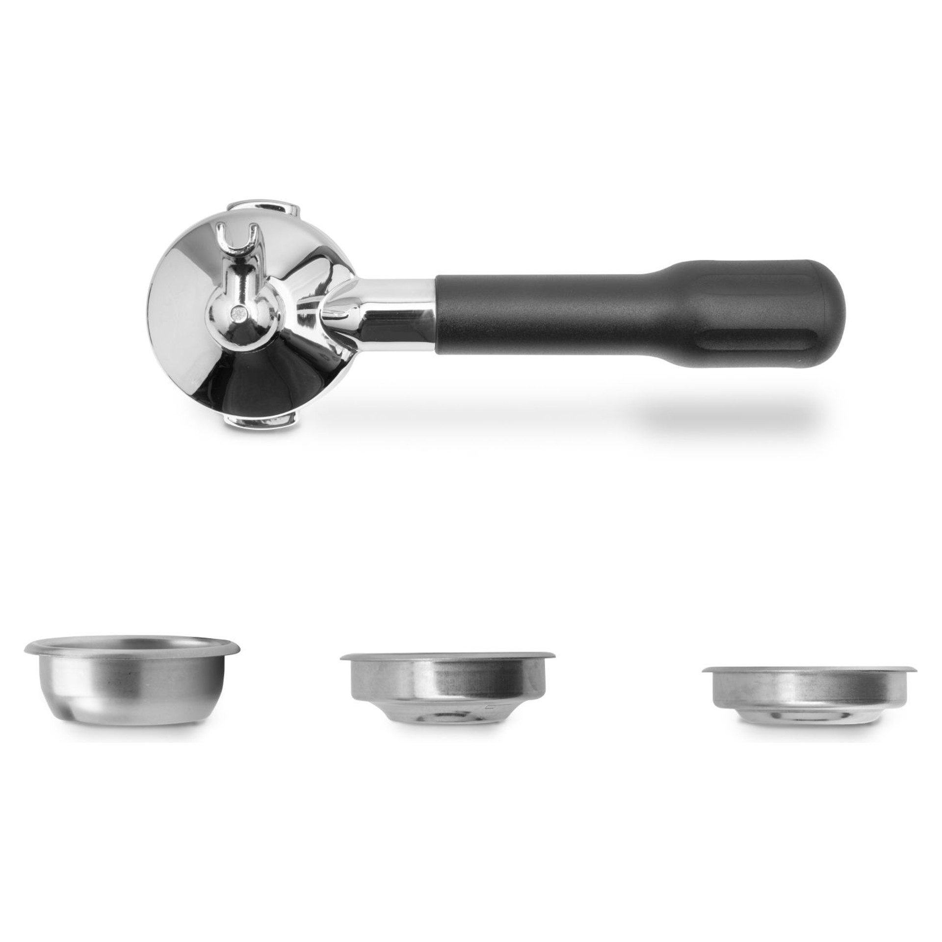 Porte-filtre 57mm à 1 sortie, en acier inoxydable avec poignée noire classique et 3 filtres 57mm en acier inoxydable : 1 dose (7-9 gr) filtre aveugle filtre pour dosettes