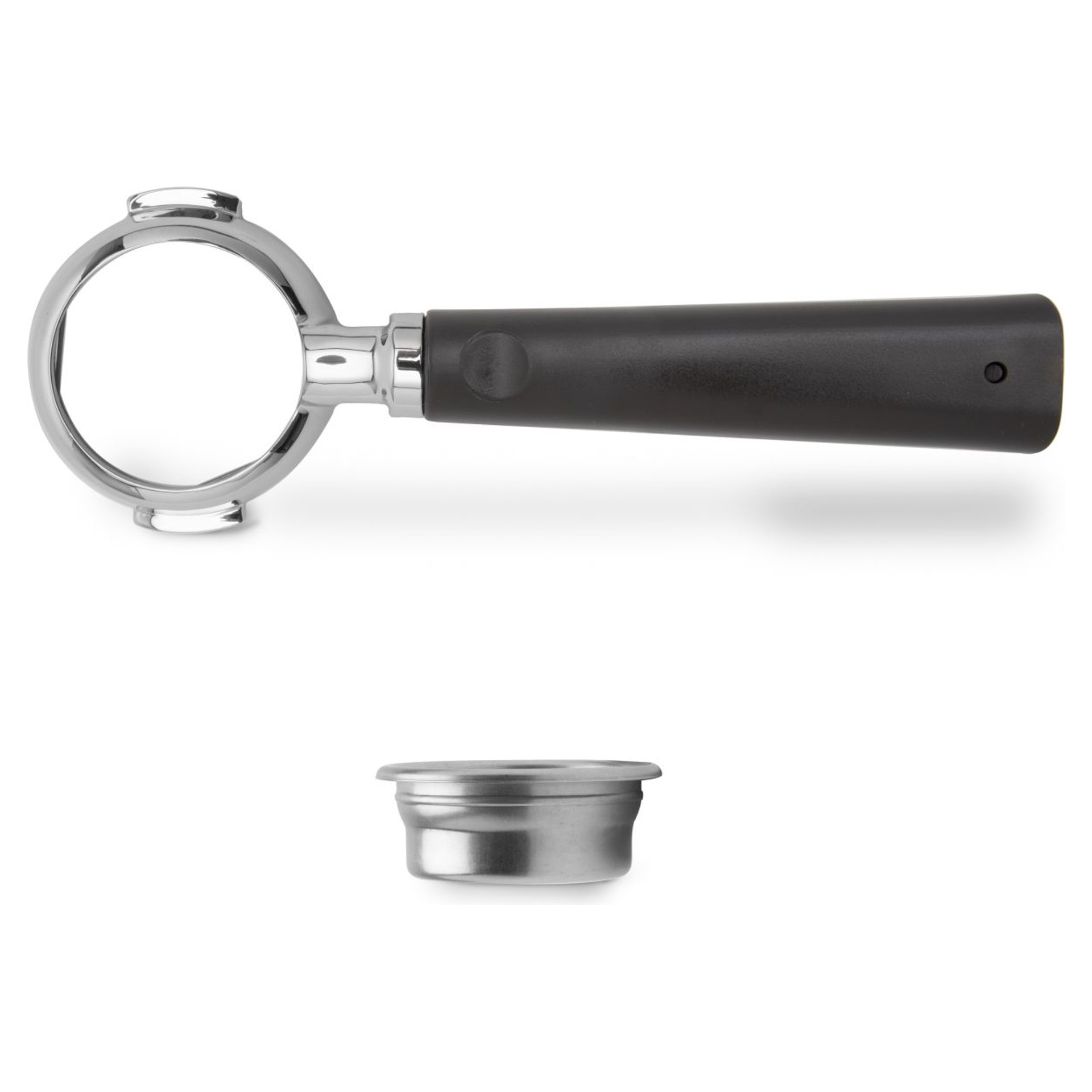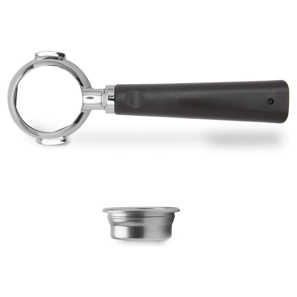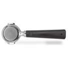 un porte-filtre 58mm Ligne VIP en acier inoxydable sans fond avec poignée brune un filtre 58mm 3 doses (18-21gr) en acier inoxydable
