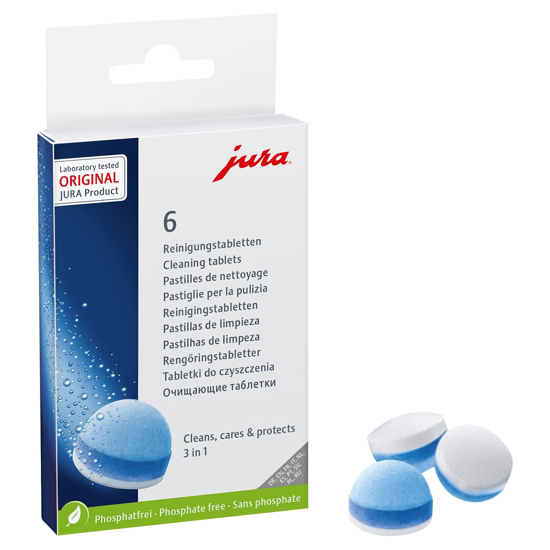 • Tablettes de nettoyage triphasées (paquet de 6).