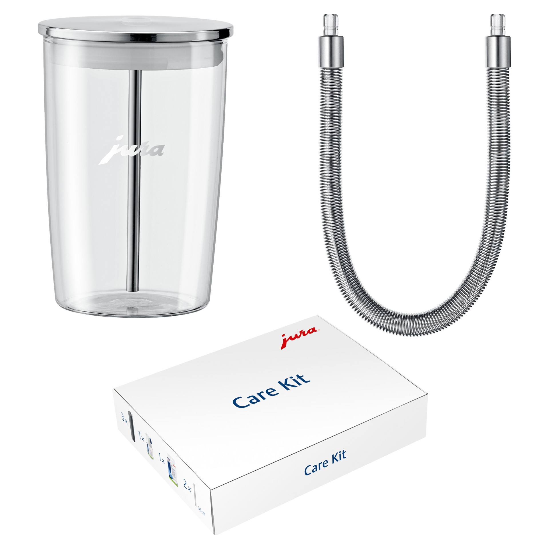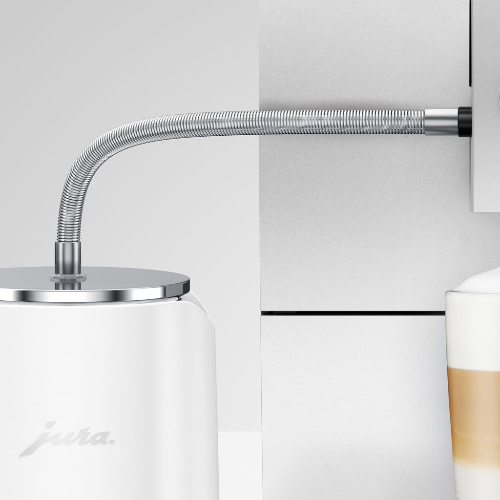 Ce tuyau de lait serti d'un ressort hélicoïdal en inox haute qualité relie le récipient à lait à l'écoulement de lait et parachève ainsi le design raffiné de votre machine à café.