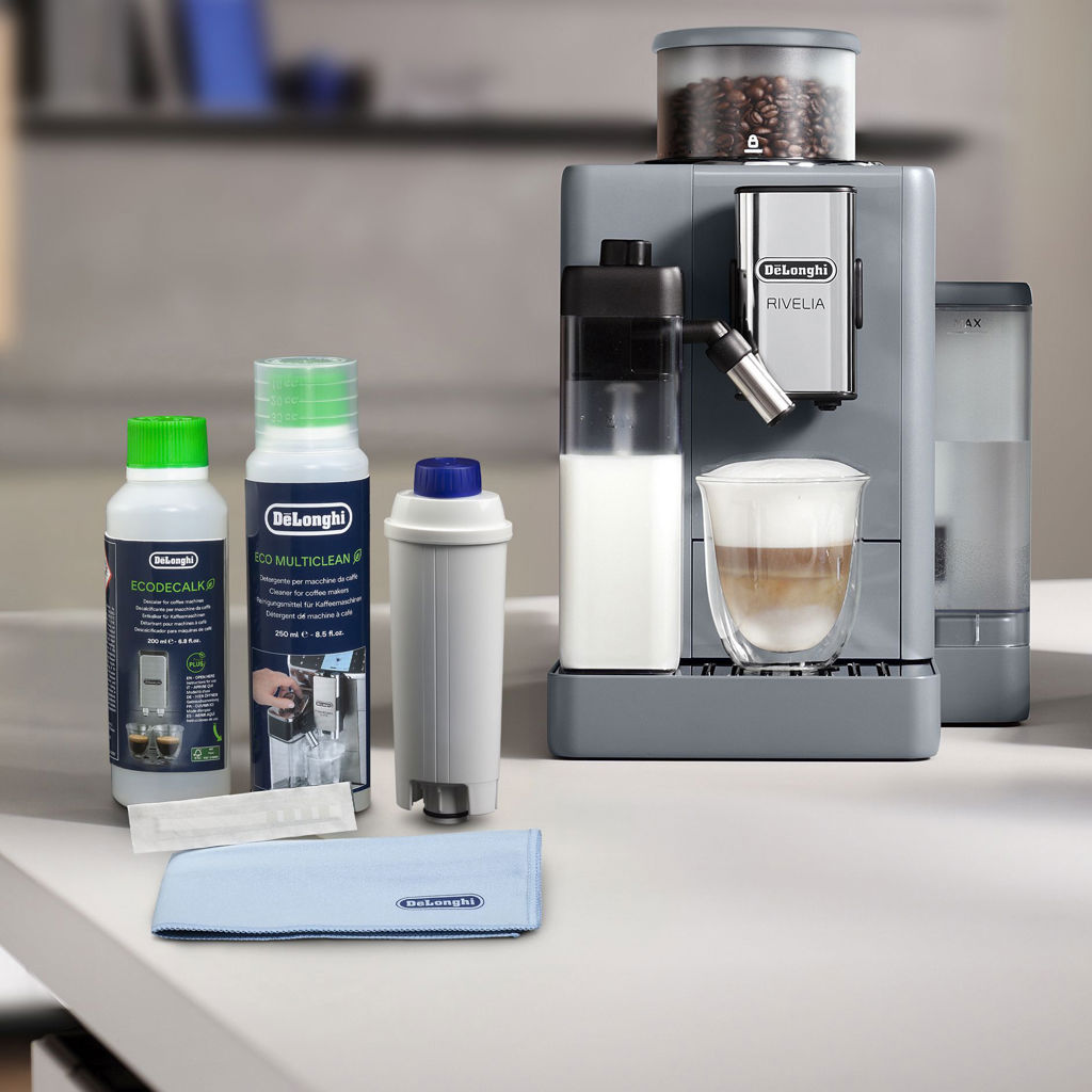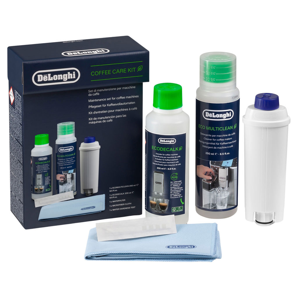Prenez soin de votre espresso broyeur automatique De’Longhi avec ce kit d’entretien, doté d’un filtre à eau, d’EcoDecalk, d’Eco MultiClean, d’un chiffon microfibre et d’un test de dureté de l’eau.