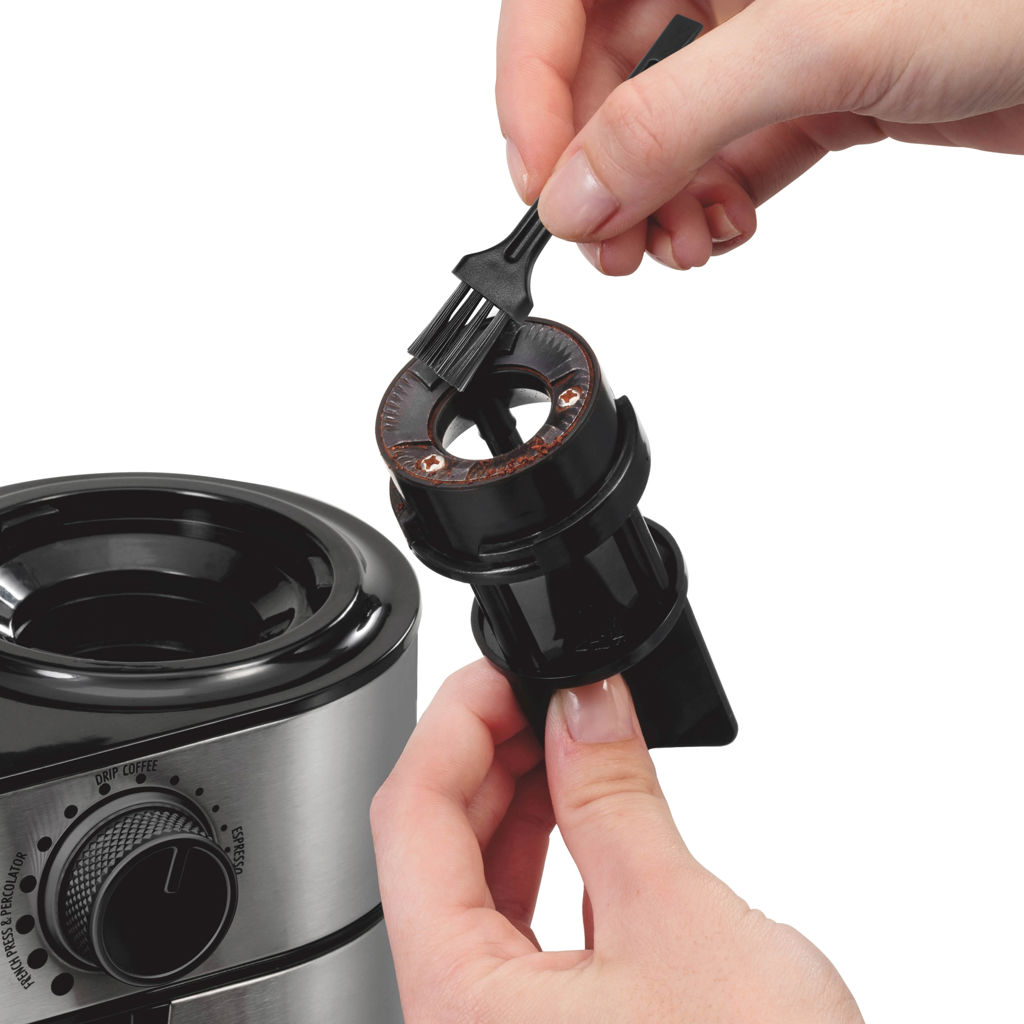 Le récipient à café moulu est muni d'un couvercle à clipser permettant de verser facilement le café moulu dans le porte-filtre sans en mettre partout. La meule supérieure se retire en quelques tours pour un nettoyage aisé. Une brosse à poils souples est fournie. Ce moulin à café à meules possède un boîtier robuste en acier inoxydable et un design compact qui permet un rangement facile et peu encombrant. Un enrouleur de câble sous la base assure un rangement propre et facile.