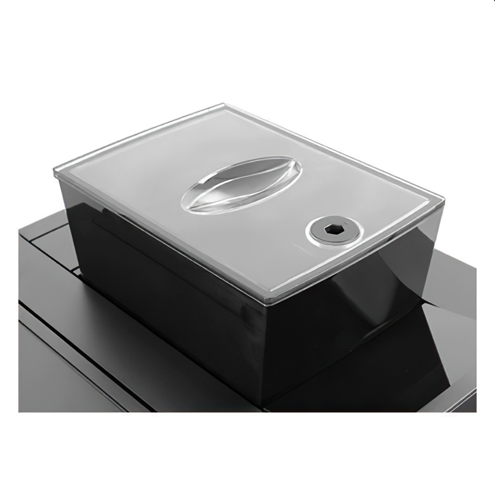 L'extension du récipient à grains augmente la capacité de charge du récipient à grains standard de 500 g à 1 kg. Le récipient à grains existant (contour noir) est remplacé par une extension. Le couvercle et la clé du récipient sont conservés.