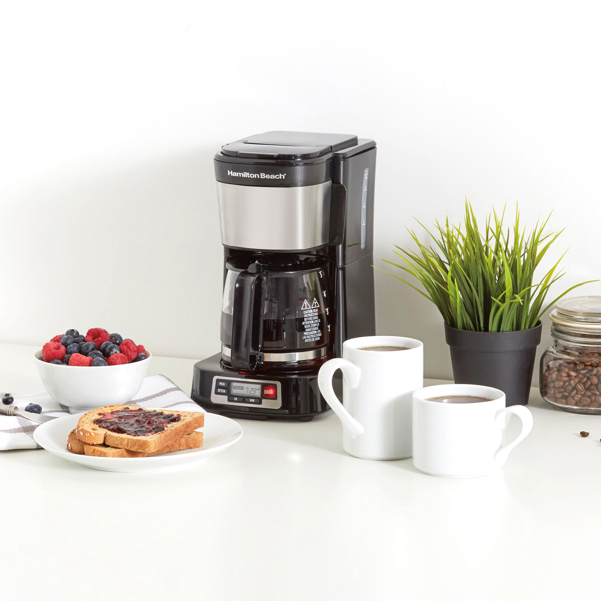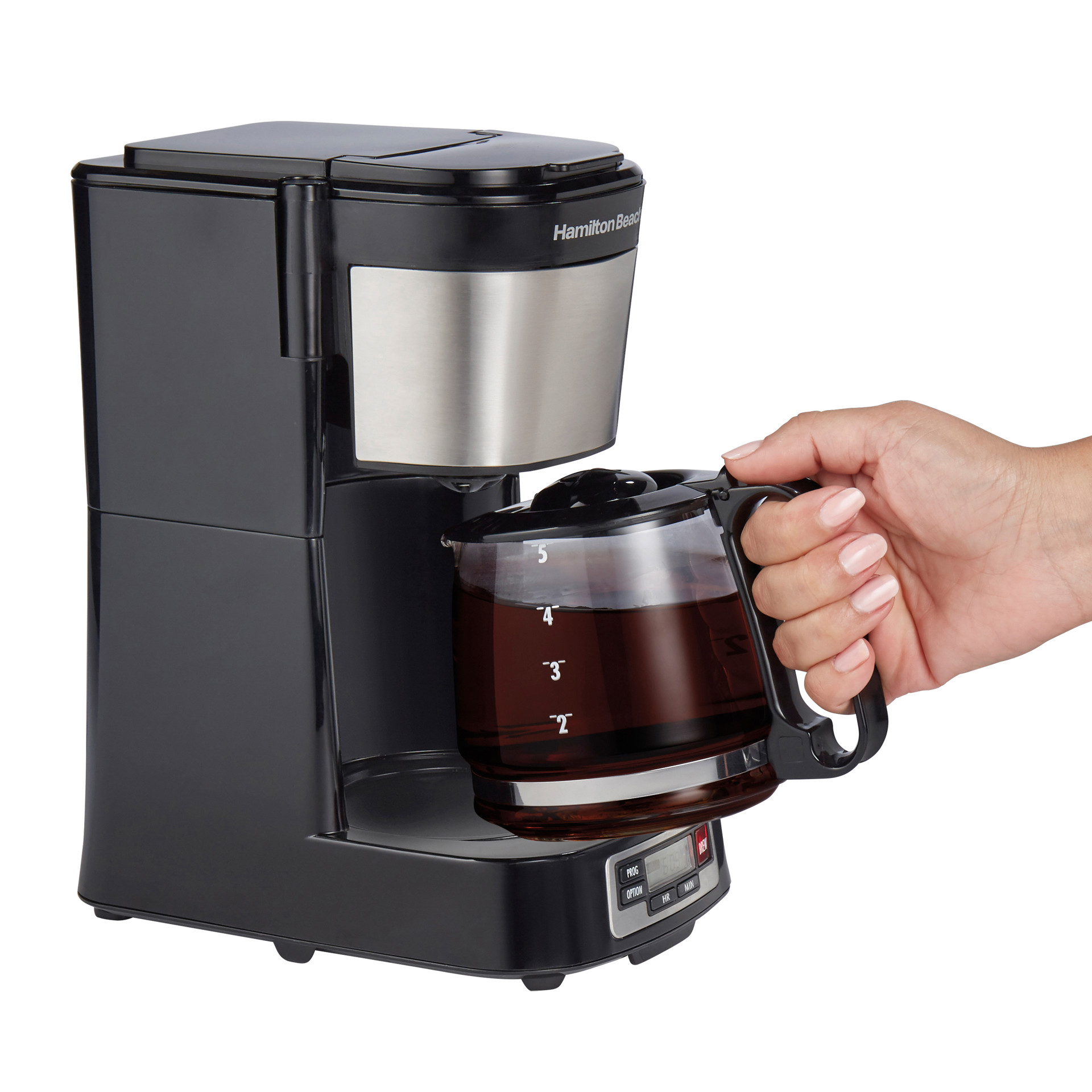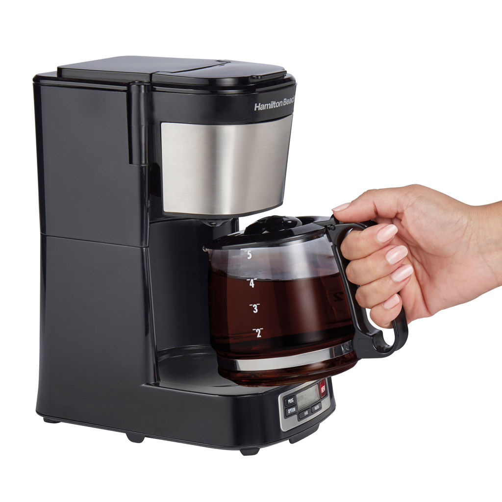 La cafetière compacte Hamilton Beach® 5 tasses avec horloge programmable présente un design compact et prépare la quantité de café idéale pour vos besoins quotidiens. Parfaite pour les petites cuisines, les appartements et tout espace où vous souhaitez optimiser votre plan de travail, elle est programmable et dotée de nombreuses fonctionnalités que l'on retrouve habituellement sur les cafetières de taille standard.