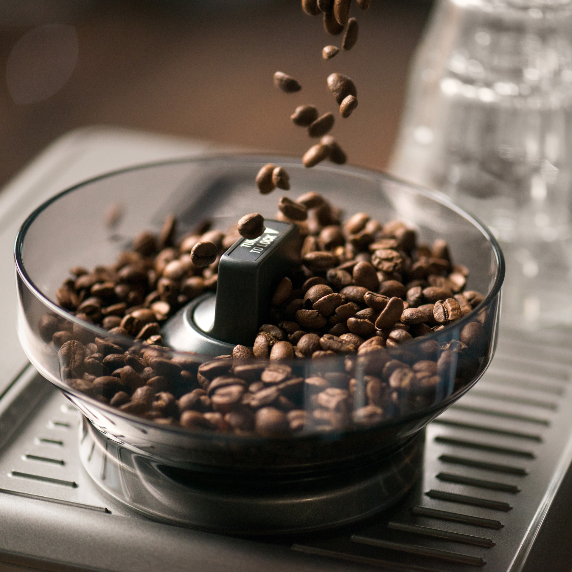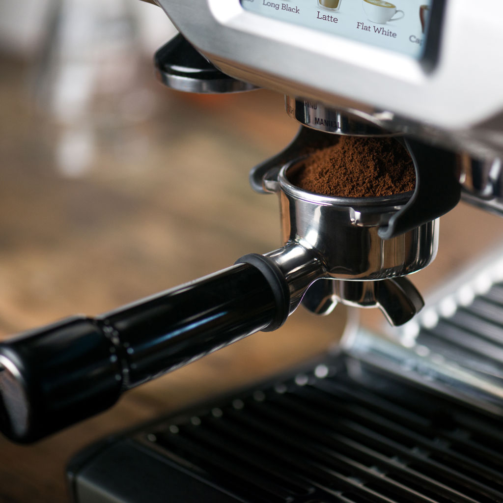 Le support de mouture innovateur permet au barista à la maison de moudre directement dans le porte-filtre.