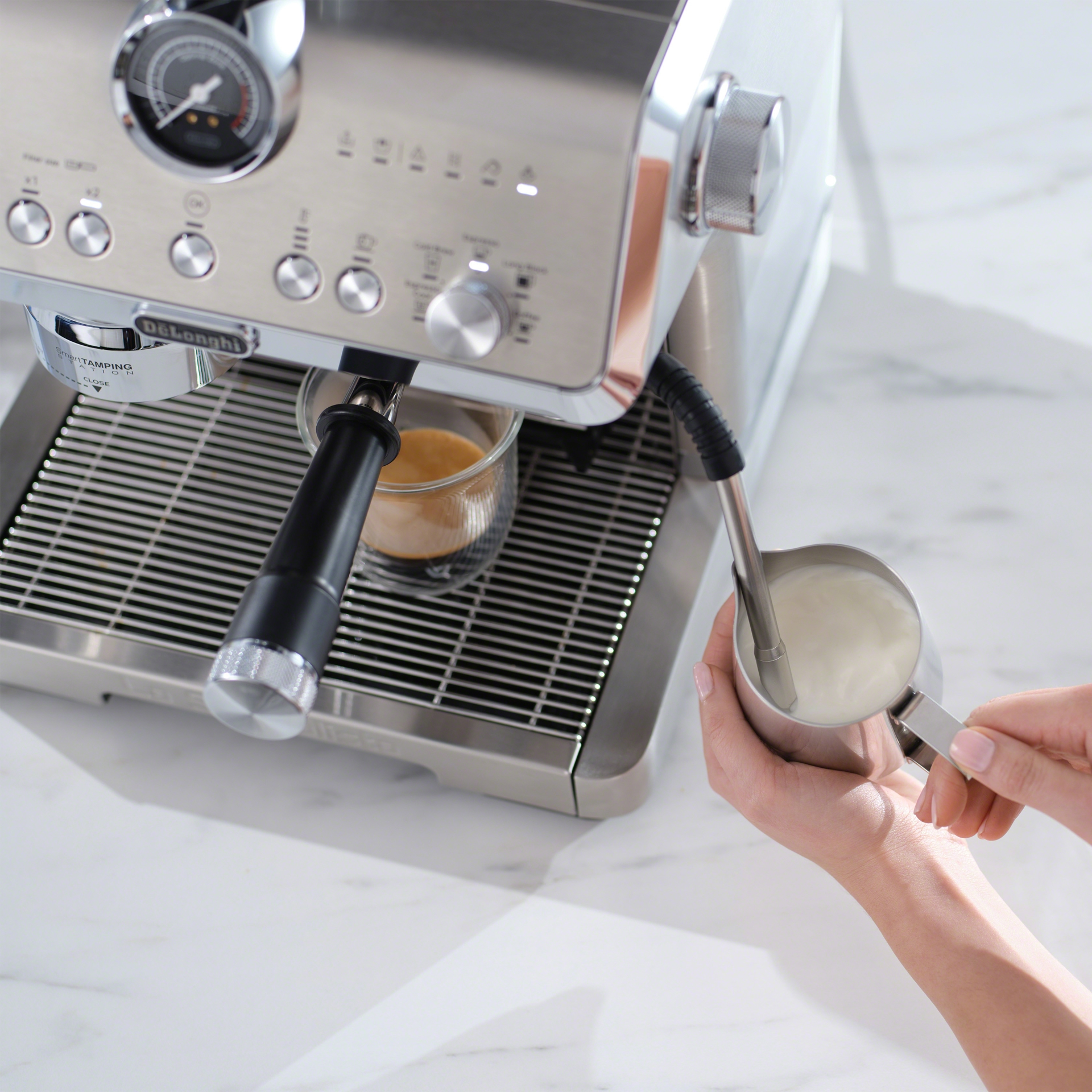• La puissante buse vapeur de type commercial chauffe rapidement et assure la pression de vapeur nécessaire à la création d’une micromousse soyeuse pour le latte art.