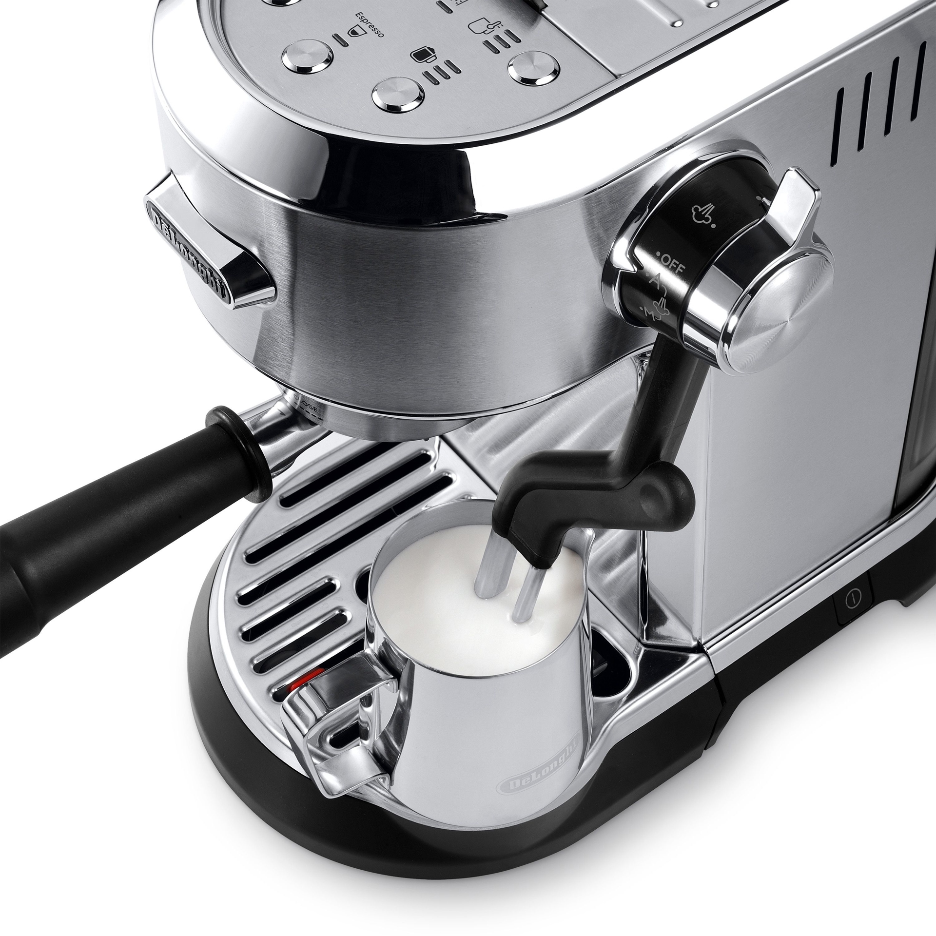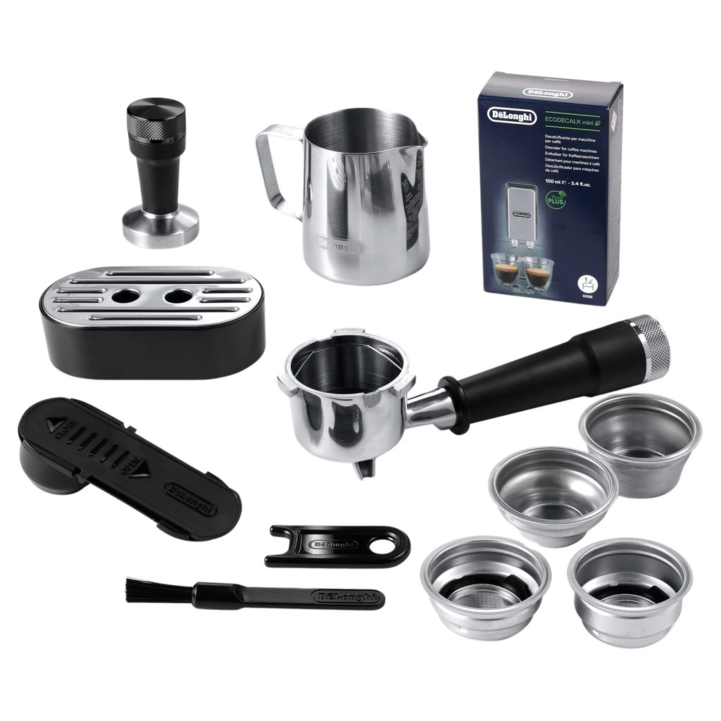 Cette machine comprend un tasse-mouture professionnel, un porte- filtre en acier inoxydable, un pot à lait en acier inoxydable et des paniers-filtres à simple et à double paroi pour des doses simples ou doubles.
