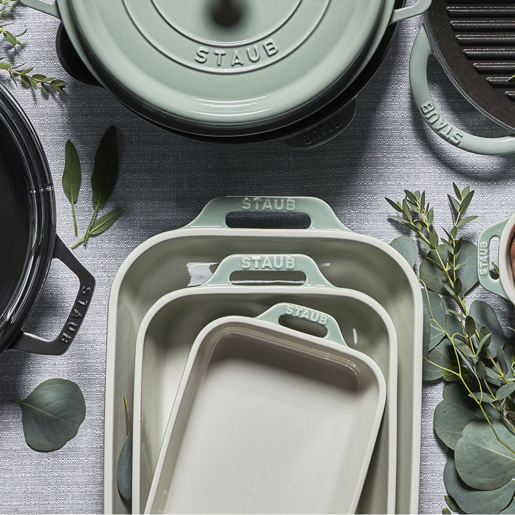 Rehaussez votre table de printemps avec notre collection de grès STAUB qui comprend des ustensiles de cuisson aux teintes pastel pour que vous puissiez préparer, cuire et servir dans le même plat. Les macarons sont la quintessence de la pâtisserie française, et ils ont été notre source d'inspiration pour nos moules rectangulaires. Leur charmante palette de couleurs rose pâle est magnifique, empilée dans une progression de couleurs ou disposée sur la table.