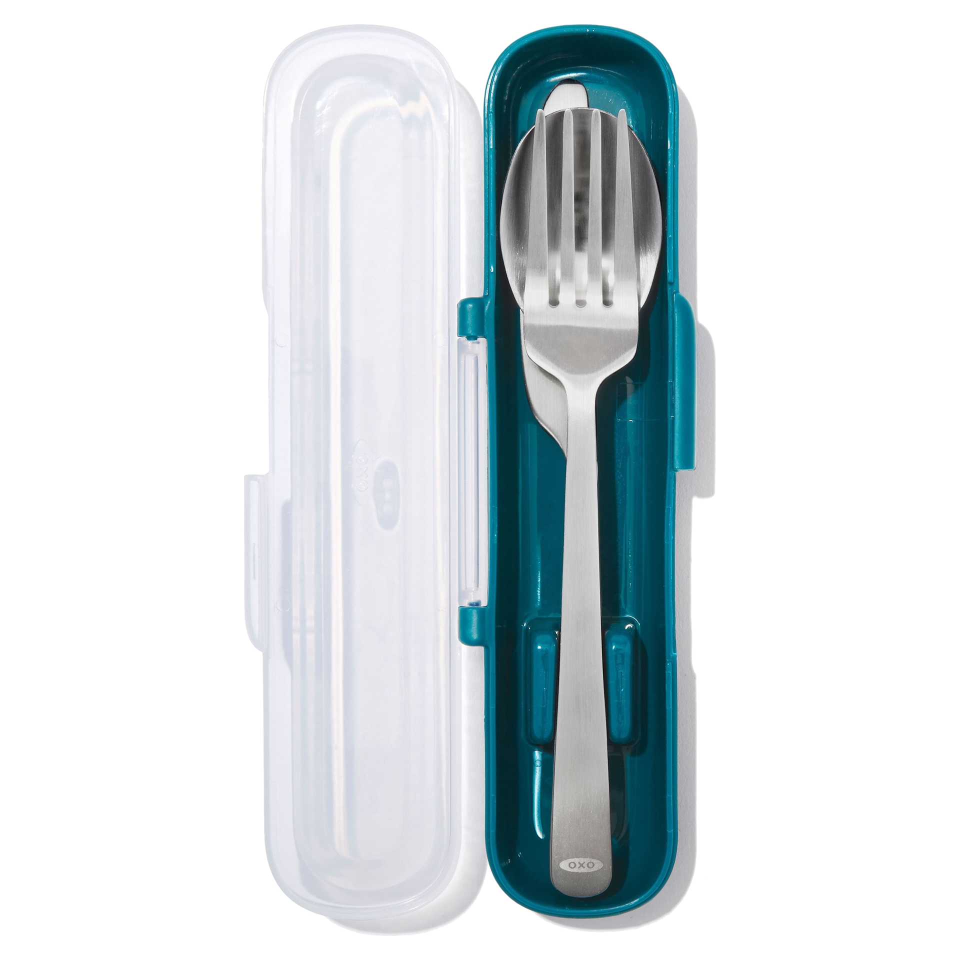 Cet ensemble réutilisable comprend une fourchette, un couteau et une cuillère pleine grandeur, tous en acier inoxydable robuste.