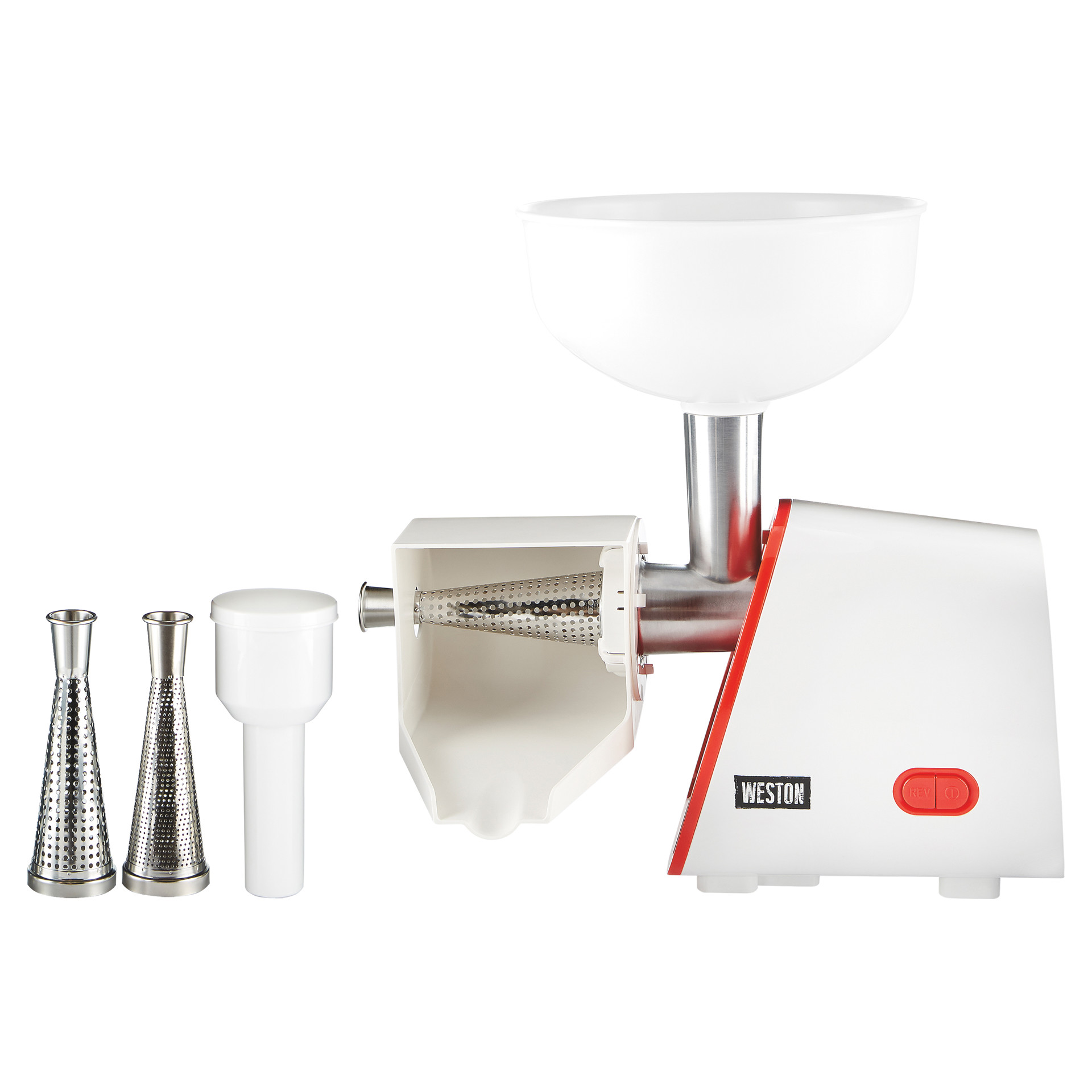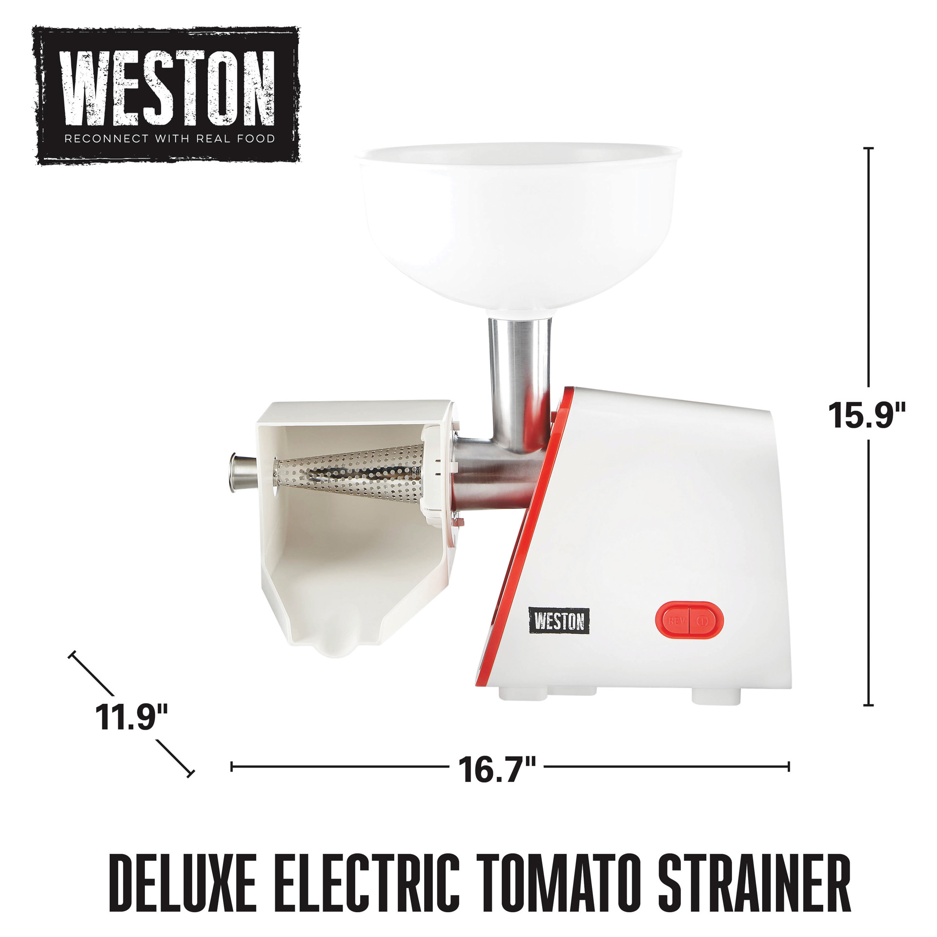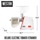 La passoire à tomates électrique Weston® Deluxe est équipée d'un moteur de 250 watts et d'une trémie d'une capacité de 3,8 litres (1 gallon) permettant de traiter rapidement de grandes quantités de fruits et légumes pour la préparation de sauces, purées, confitures, salsas et autres préparations maison. Elle est fournie avec un poussoir et 3 tamis en acier inoxydable.