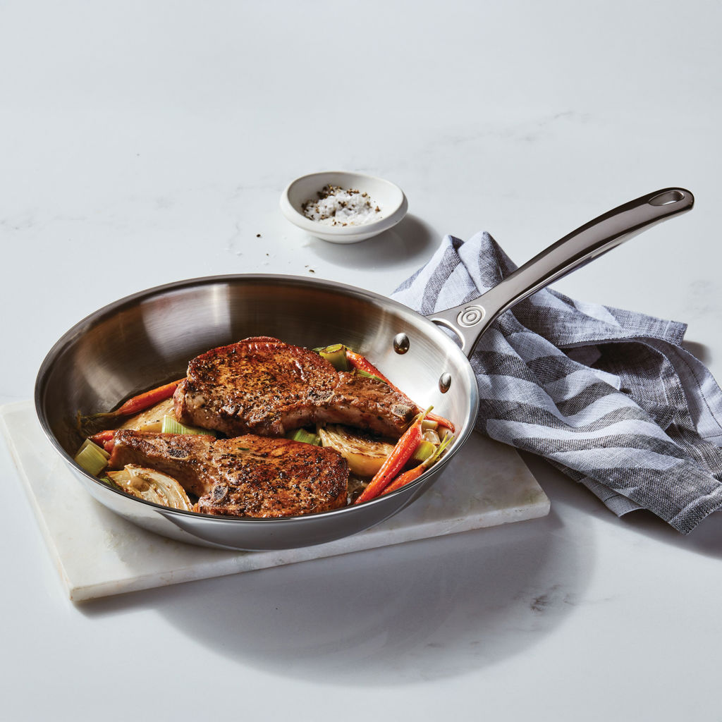 La poêle en acier inoxydable Le Creuset est un autre ajout pertinent à votre batterie de cuisine; il s’agit de l’article par excellence pour frire à la poêle et saisir les aliments à la perfection. En comparaison d’autres matériaux, l’acier inoxydable résiste aux températures très élevées; il retient donc la chaleur de façon remarquable et résiste aux marques de brûlure.