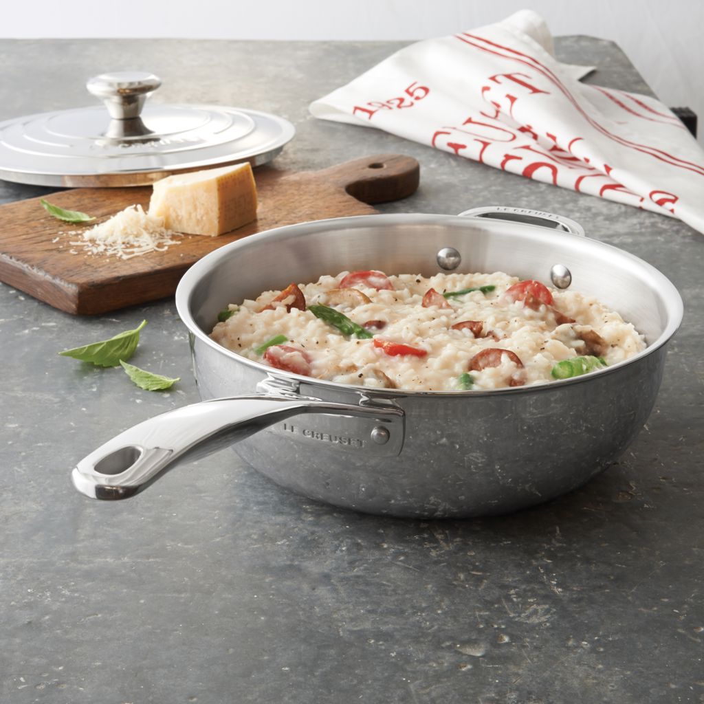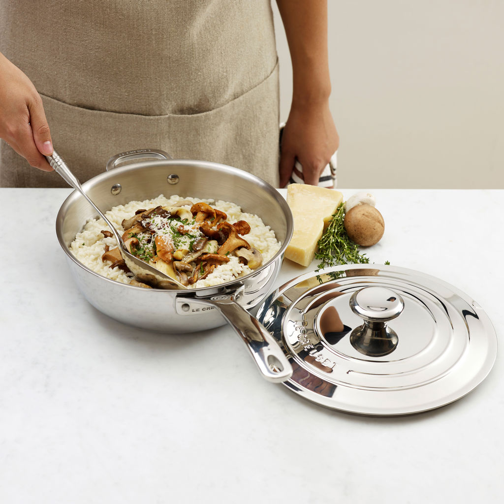 La sauteuse du chef en acier inoxydable convient parfaitement à la préparation de mets aux saveurs complexes qui nécessitent le mouvement continu des ingrédients, y compris les sauces, les risottos et les flans.