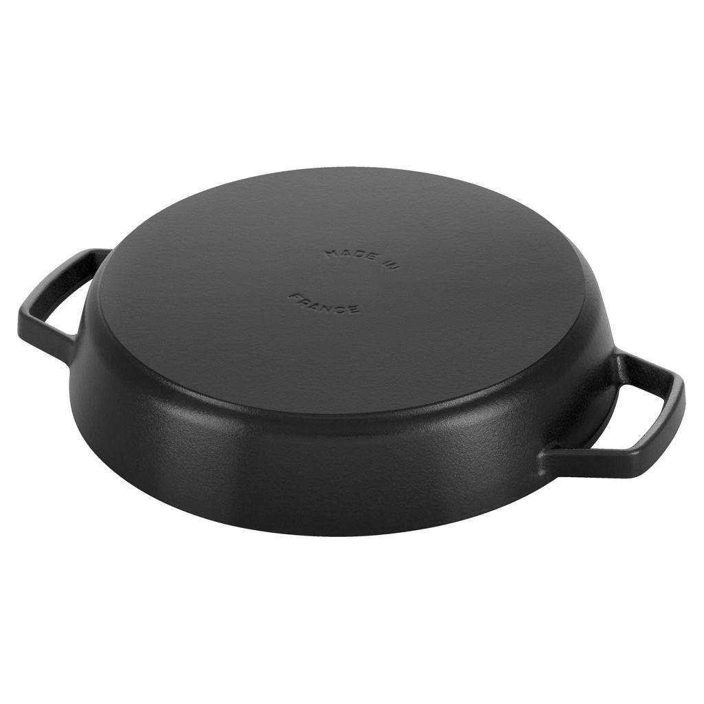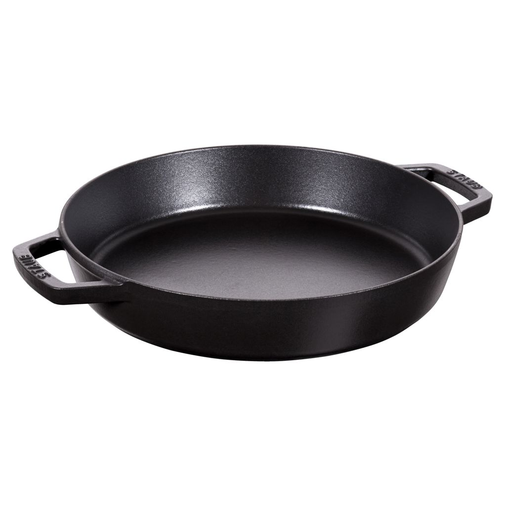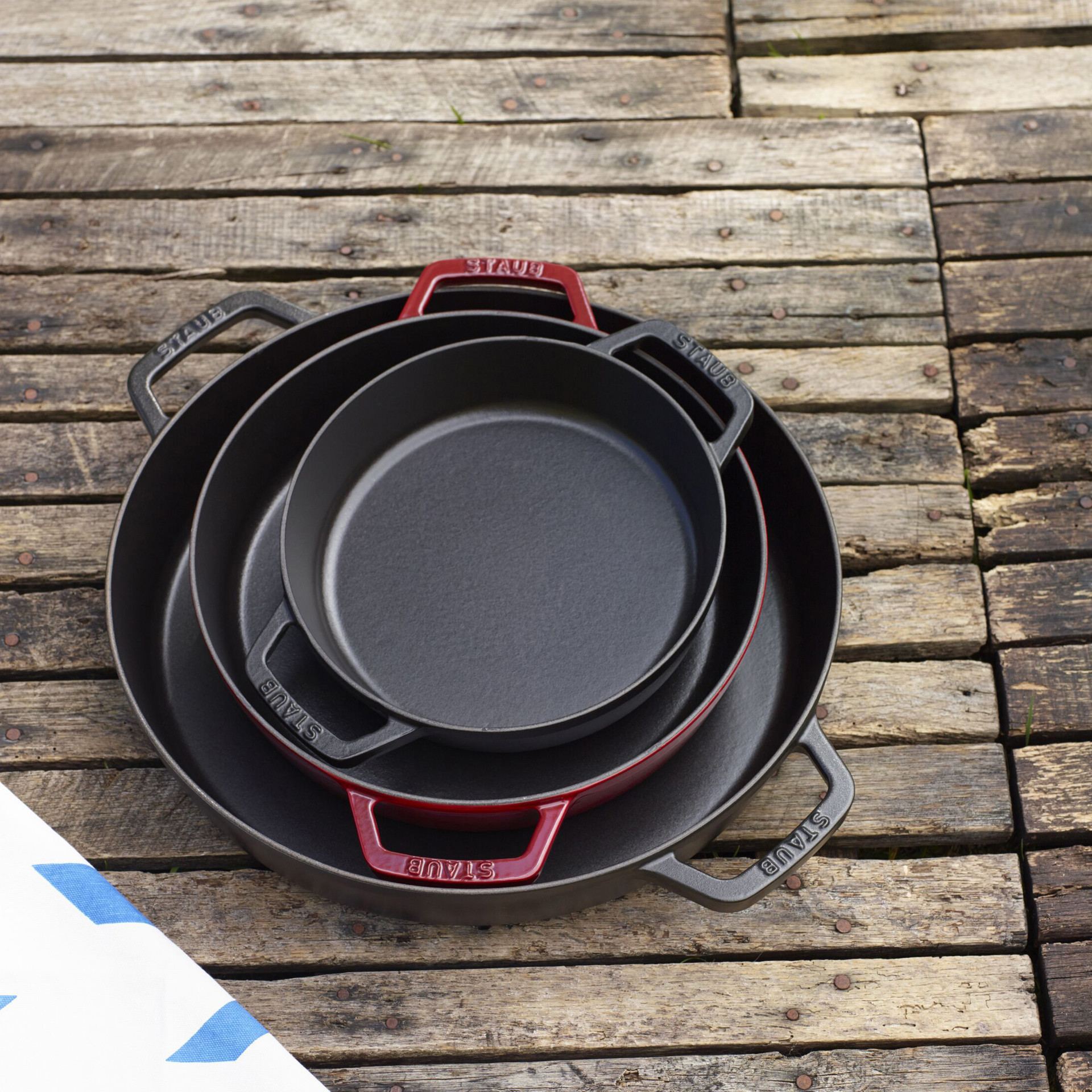 La poêle Staub à double poignée a une base plate et peut être utilisée sur toutes les cuisinières, y compris les plaques à induction et les fours.