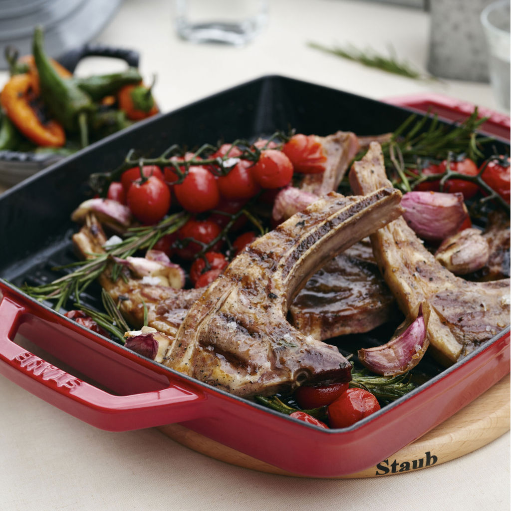 La plaque à griller carrée de la série Staub est une alternative ou un complément parfait à une grille de barbecue classique. Les aliments ont l'air d'avoir été cuits sur une grille de barbecue, grâce à la structure rainurée à l'intérieur.