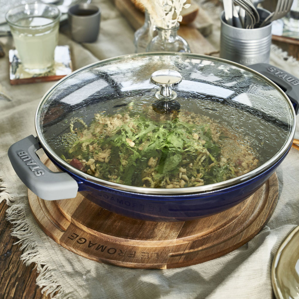 Elle est parfaite pour saisir les viandes et faire sauter les légumes, ainsi que pour les cuire en douceur. Les ustensiles de cuisine en fonte de Staub se prêtent aussi parfaitement au braisage, à la cuisson à l'étouffée et à la friture.
