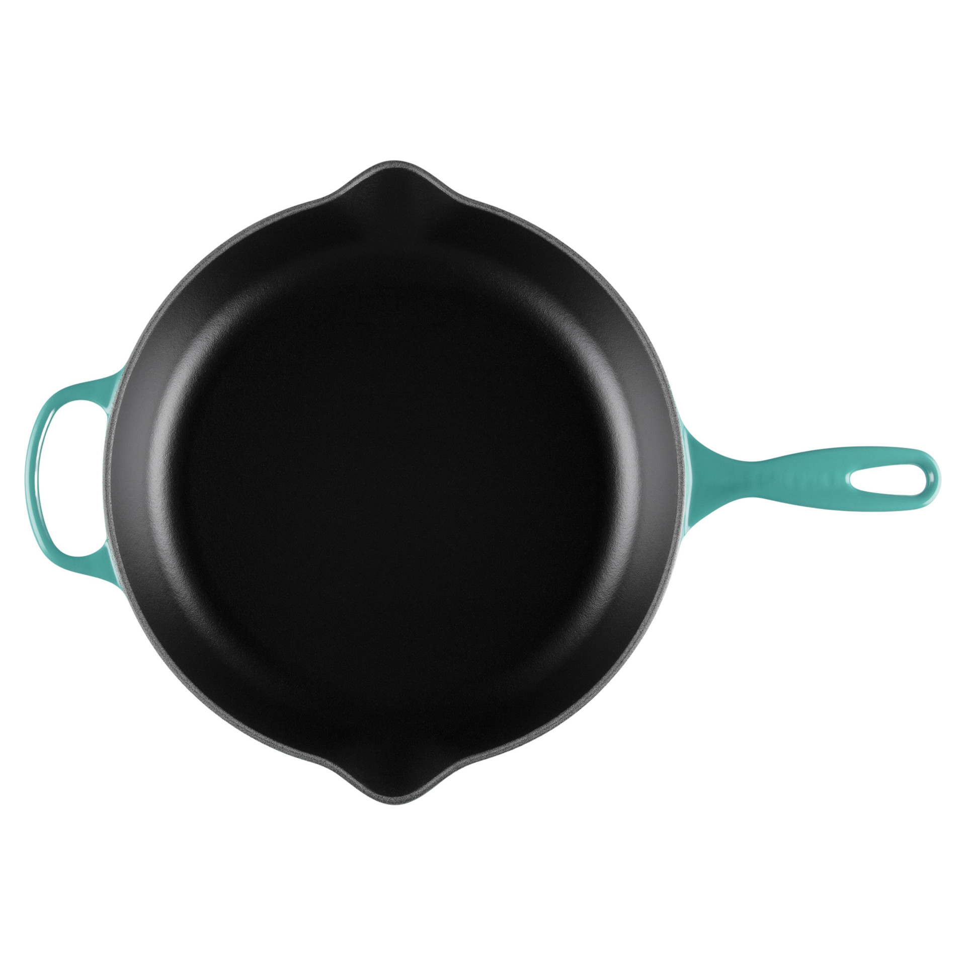 Conçue en fonte émaillée, cette poêle est particulièrement durable et résiste à un usage quotidien. Le bec verseur de chaque côté de la poêle de fonte permet de verser et de transférer les aliments en toute simplicité, tandis que sa poignée facilite son transport de la cuisinière à la table.