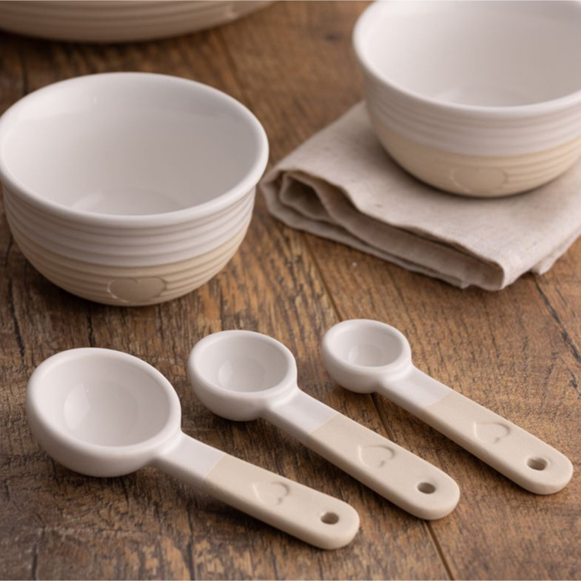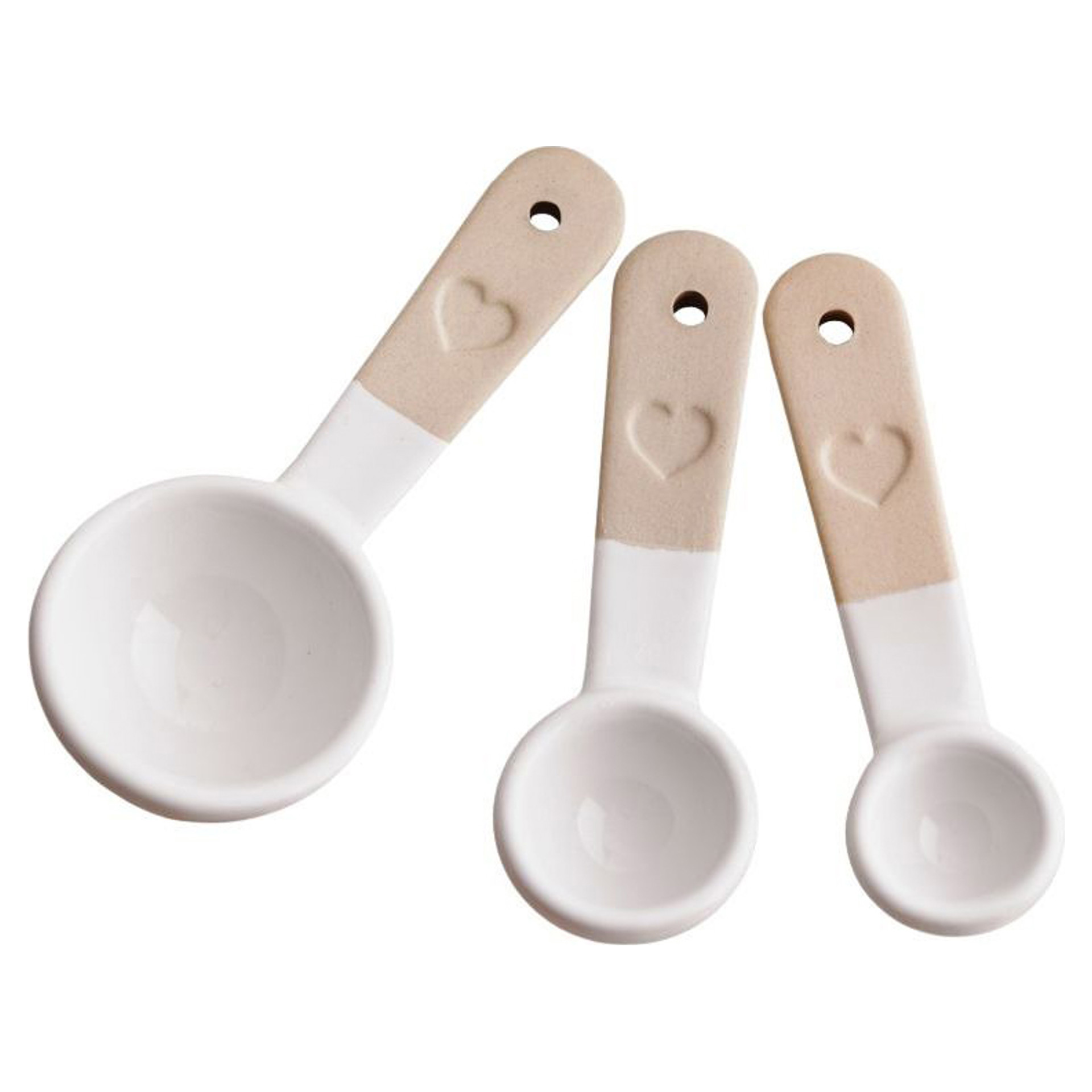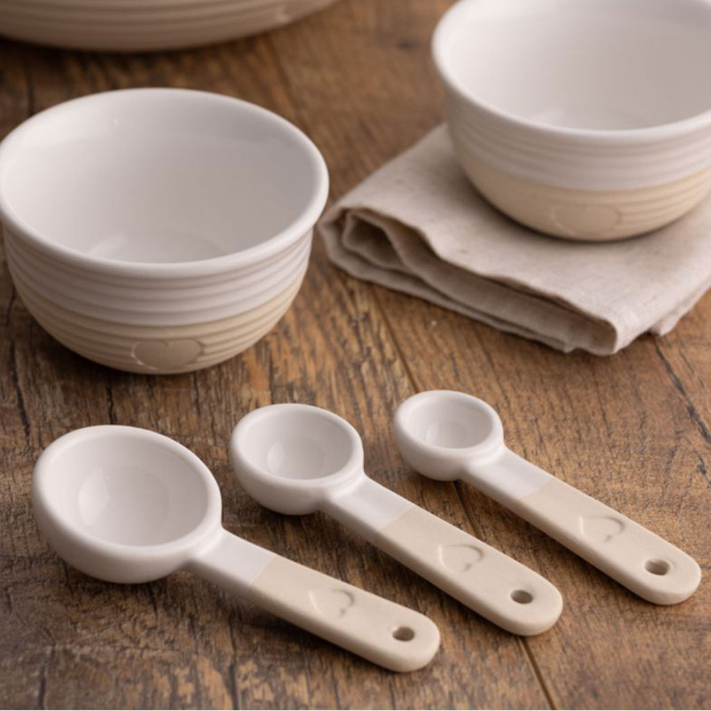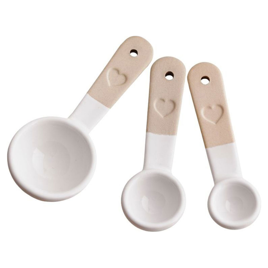 Cuillères à mesurer, jeu de 3, en grès. Ornées de délicats motifs en relief en forme de cœur et d’un subtil mélange de finis mats et brillants dans des tons neutres, elles apportent tout le charme de la campagne à votre cuisine.