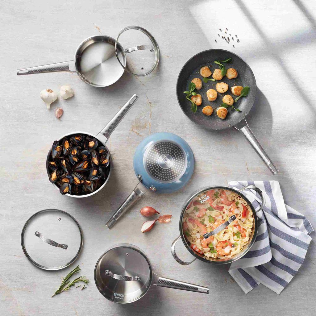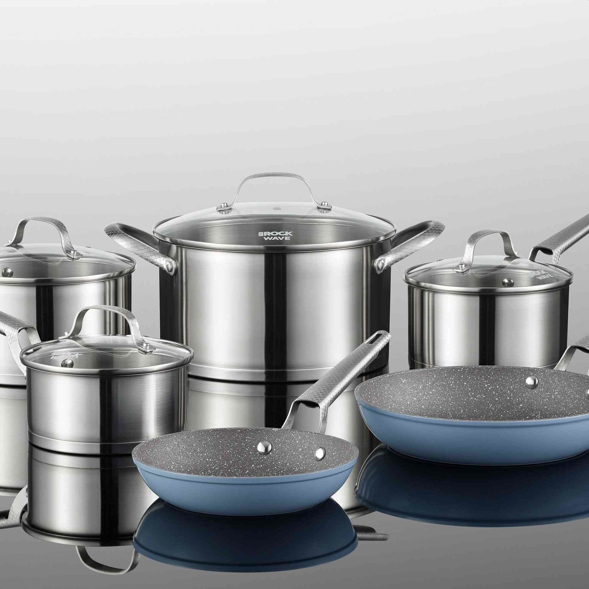 Notre dernier-né dans la famille The Rock : The Rock WAVE. Sa poignée a une texture WAVE.TEC unique pour une prise en main antidérapante et des performances supérieures. L'ensemble de batterie de cuisine en acier inoxydable est une construction à trois couches et est sans danger pour l'induction. Les poêles à frire ont un traitement de surface antiadhésif et un revêtement sans PFOA. Bonus : c'est aussi prêt pour l'induction !