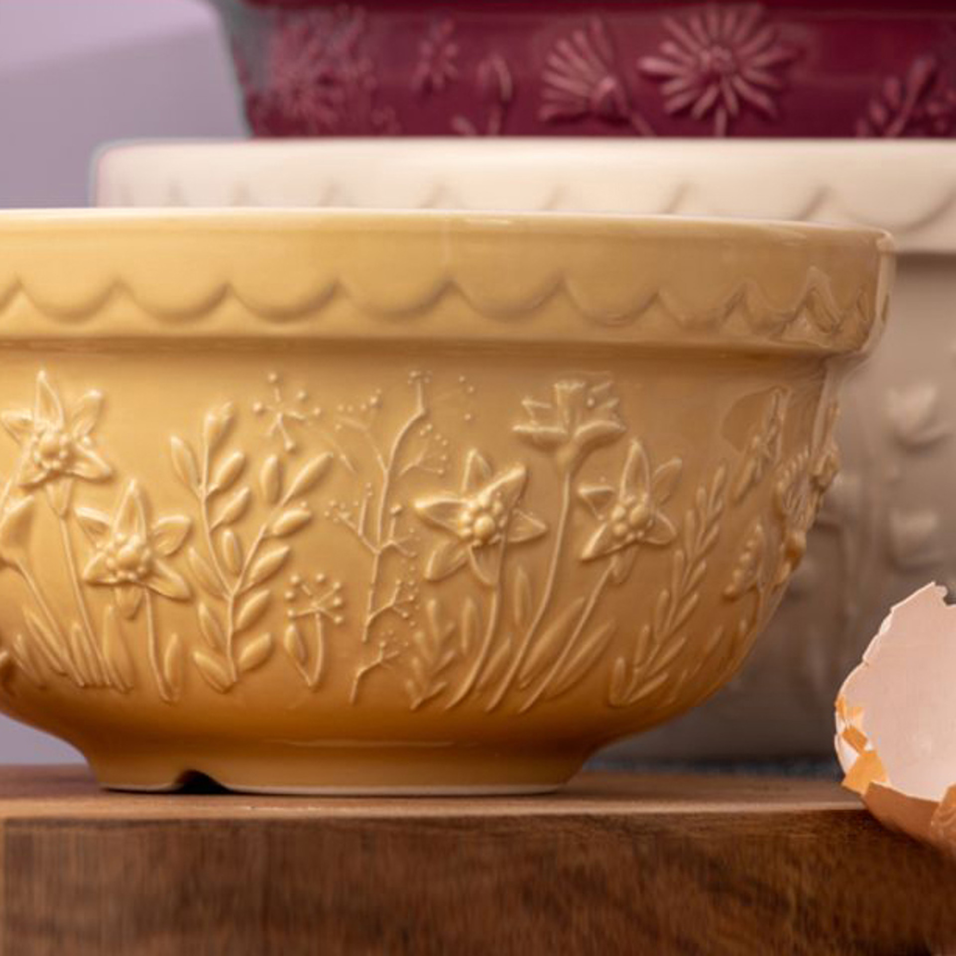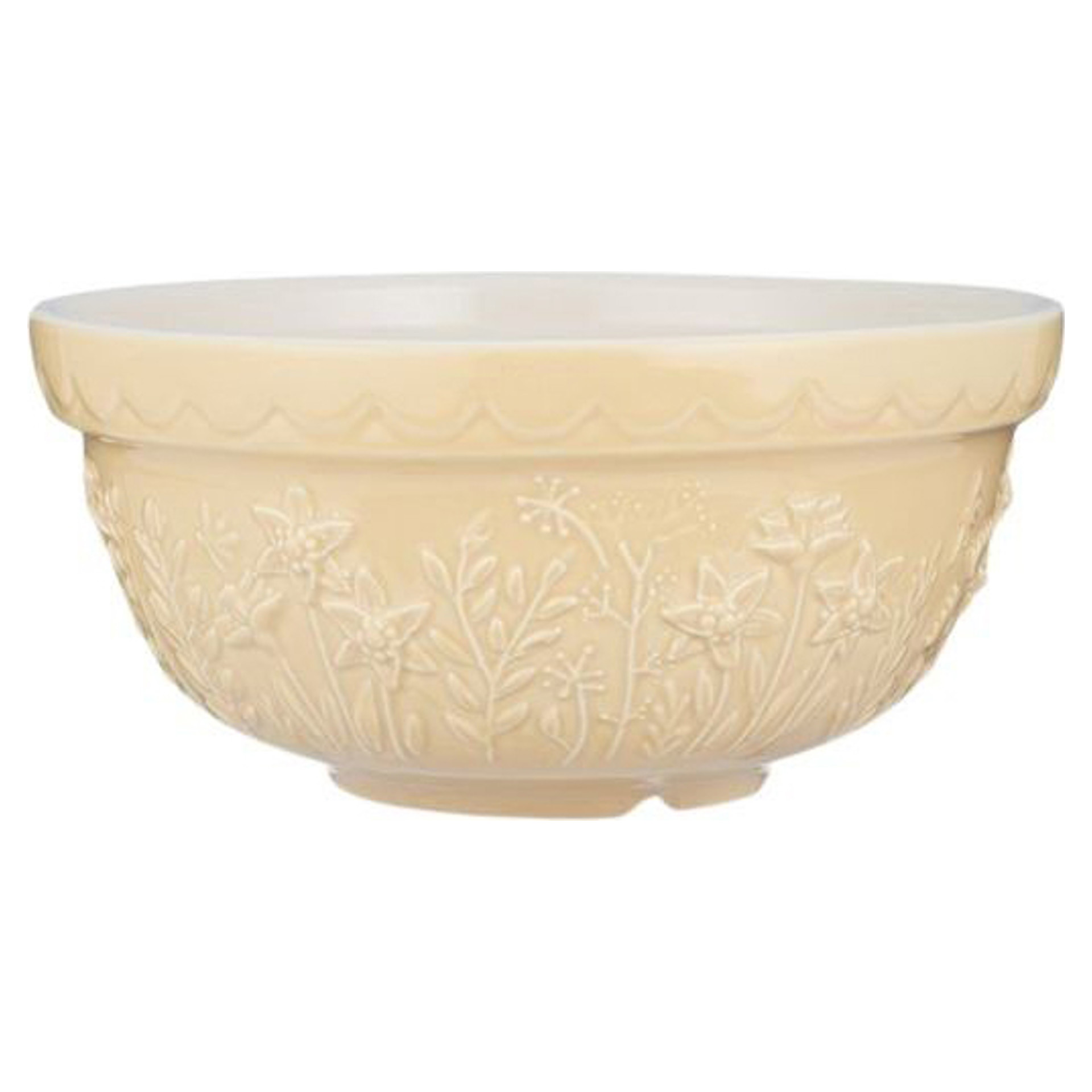 Bol à mélanger de 1,1 L / 1 qt, format 21 cm / 8,25 po de diamètre, en céramique jaune. Délicieusement détaillé et finement embossé de motifs inspirés des prairies, il apporte une touche de charme à la cuisine tout en restant pratique au quotidien.