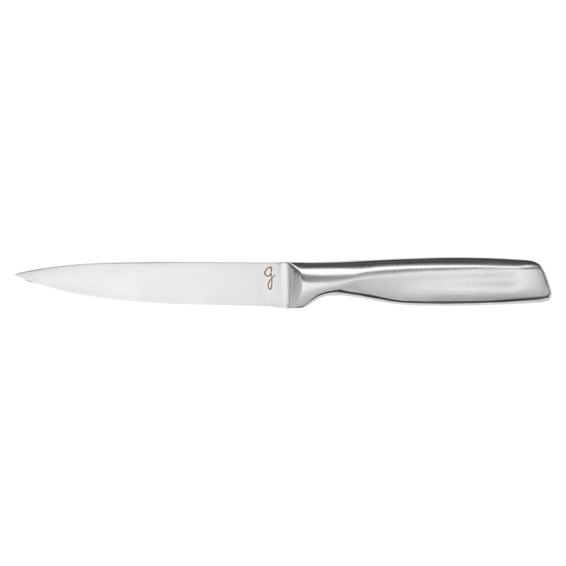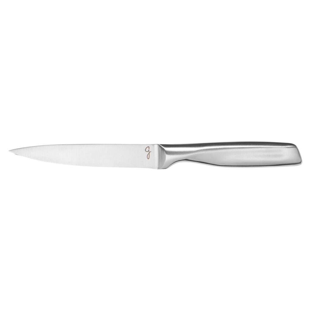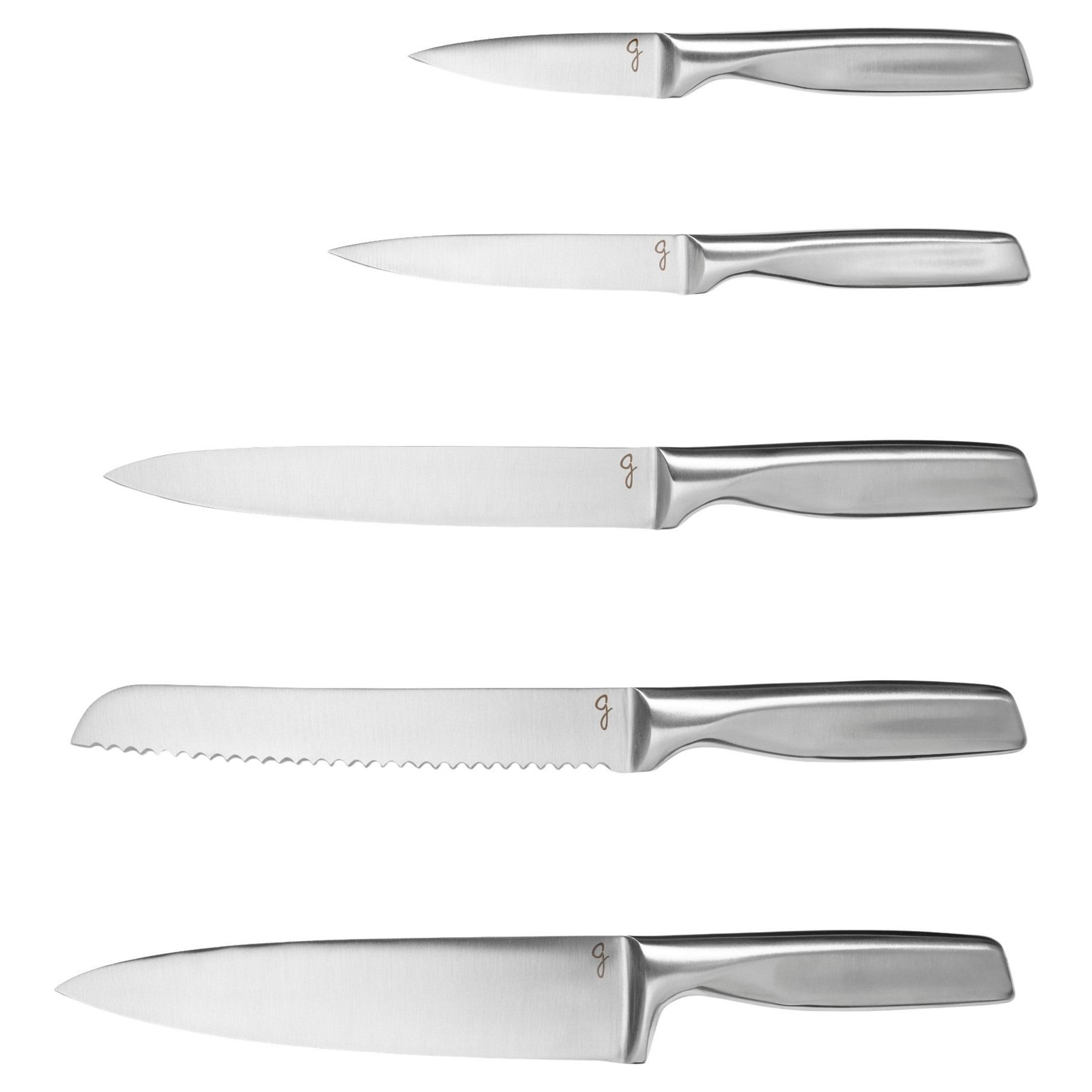 • Ensemble 5 pièces comprenant un couteau d’office 8,9 cm (3.5 po), un couteau utilitaire 12,7 cm (5 po), un couteau à trancher 20,3 cm (8 po), un couteau à pain 20,3 cm (8 po) et un couteau de chef 20,3 cm (8 po)