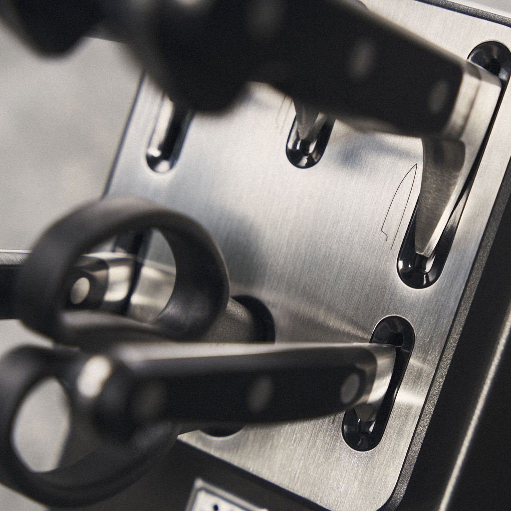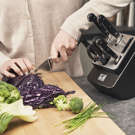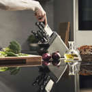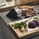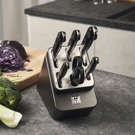 Autant de points forts pour une performance encore meilleure dans la cuisine. Mais il y en a un de plus : Le bloc est doté d'éléments céramiques intégrés dans les compartiments d'insertion des couteaux à lame droite, qui vous permettent d'affûter automatiquement vos couteaux à chaque utilisation. Tirez, poussez, l'aiguisage se fait automatiquement. Non seulement vos couteaux couperont mieux, mais ils dureront plus longtemps.