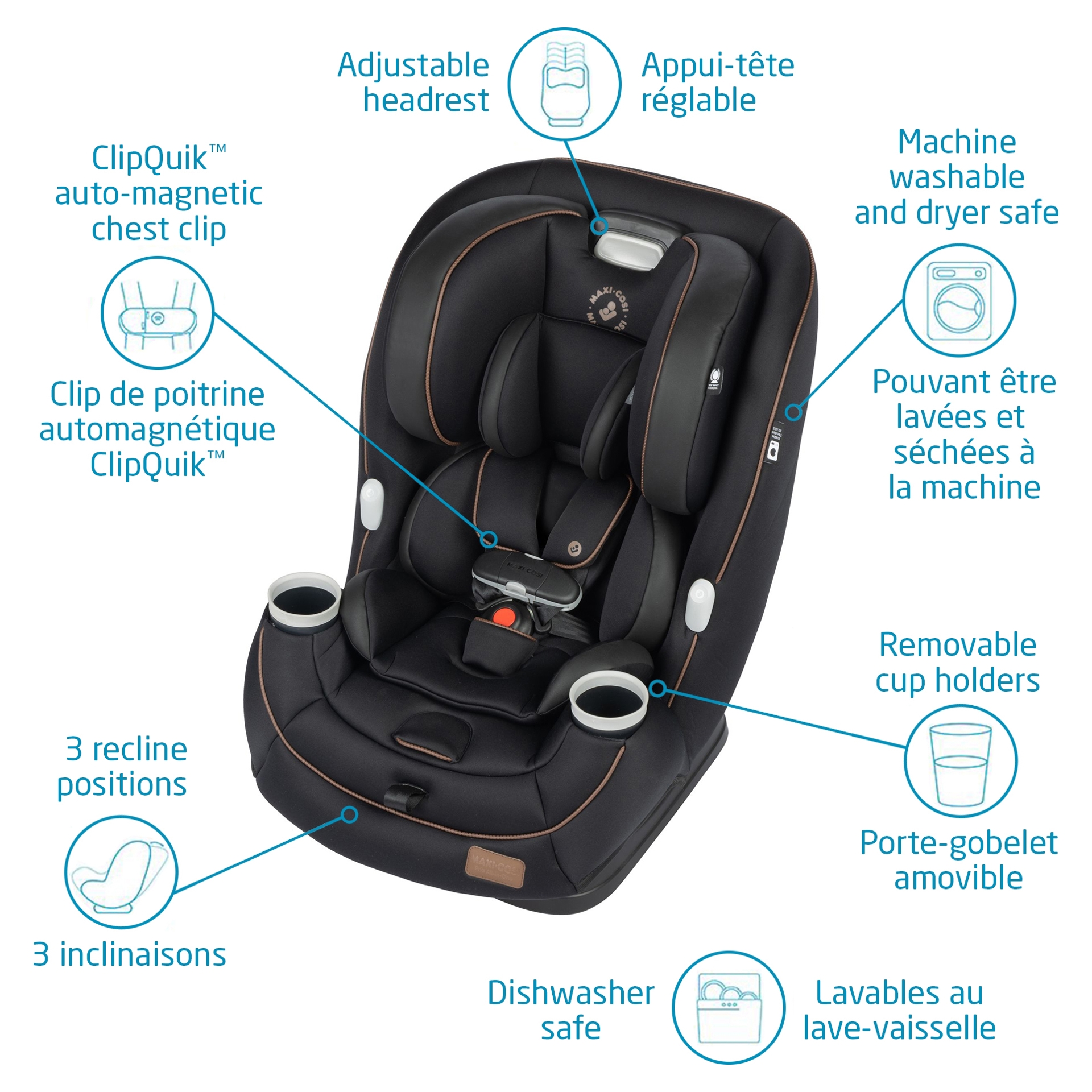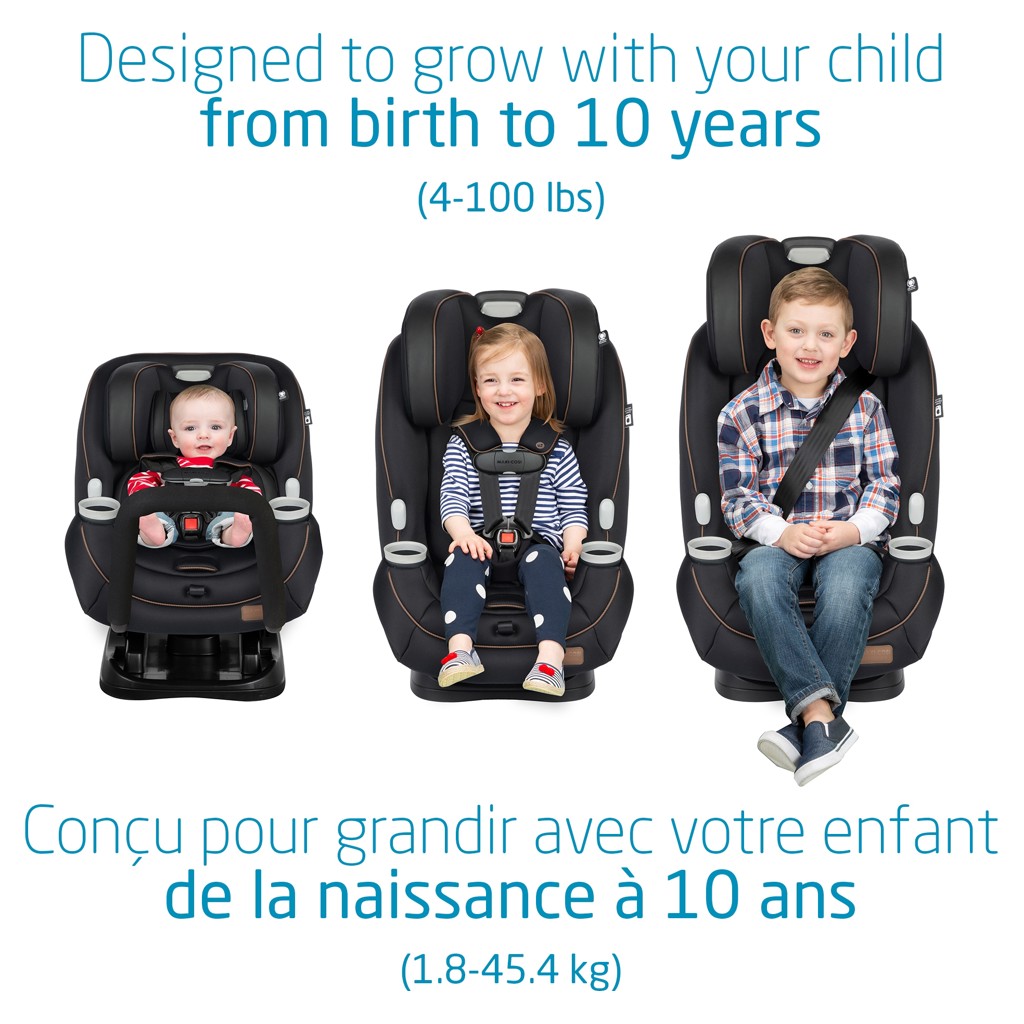 Les enfants peuvent voyager face vers l´arrière, de 1.8 à 18.1 kg (4-40 lb); face vers l´avant jusqu´à 29.4 kg (65 lb); et jusqu´à 45.3 kg (100 lb) en mode siège d´appoint. C´est peut-être le seul siège d´auto dont vous aurez besoin.