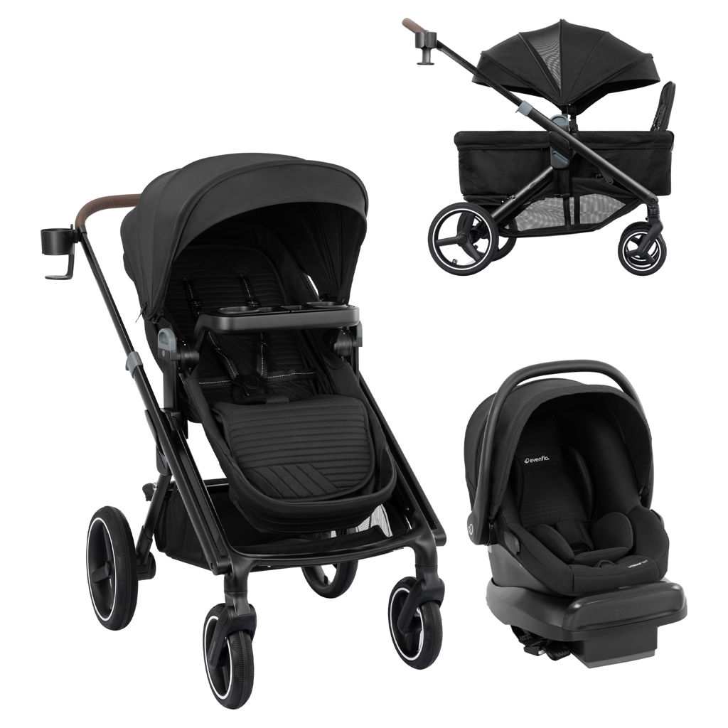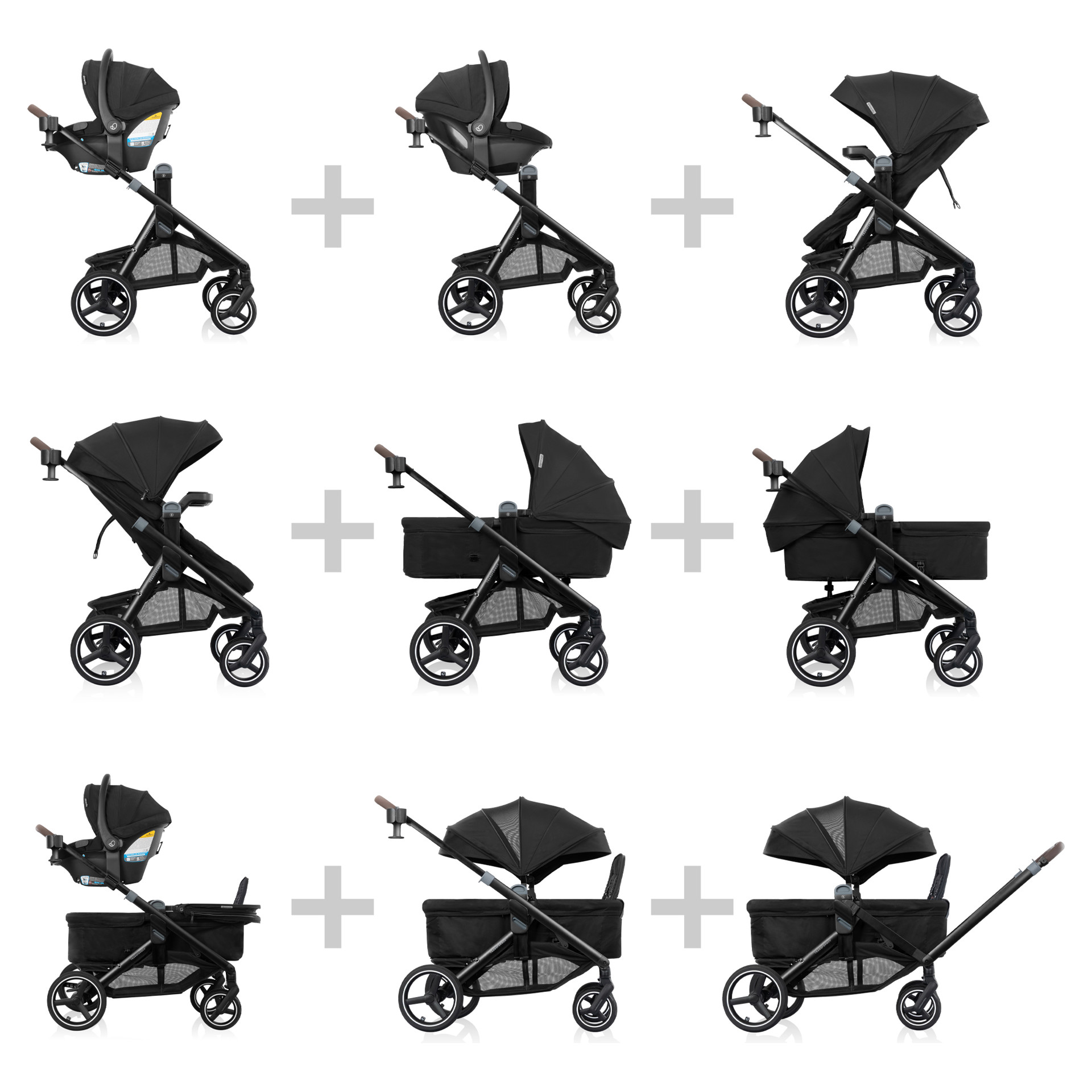 Un seul produit. Tous les modes. Toutes les étapes. Le système de voyage Evenflo® Transformer™, poussette transformable en chariot, avec le siège auto pour bébé LiteMax™ NXT, se transforme facilement de poussette en chariot, sans pièces ni accessoires supplémentaires.