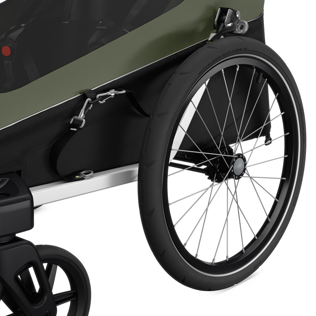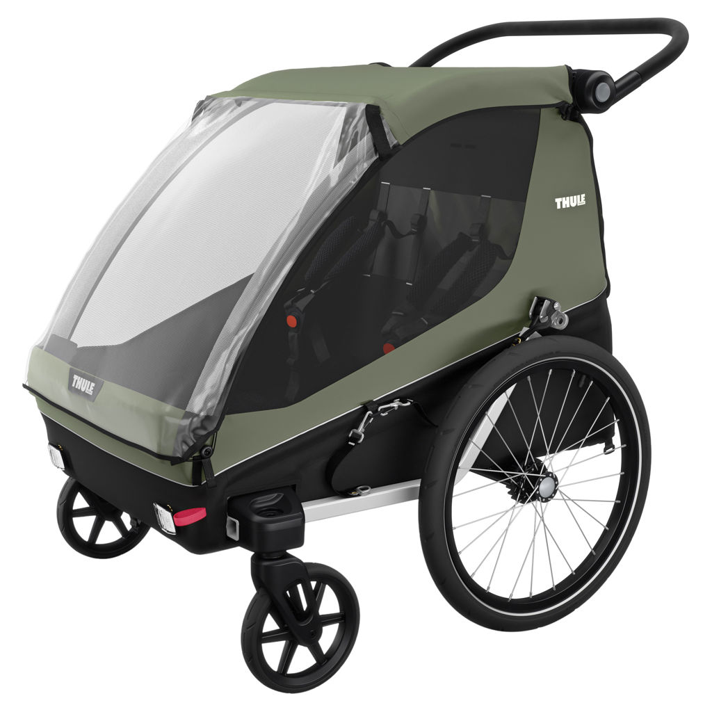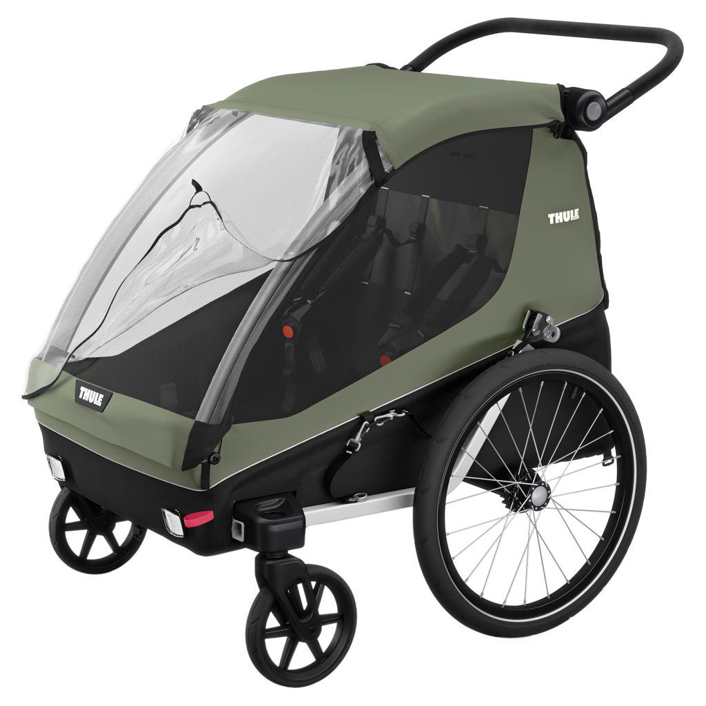 C'est un excellent porte-vélos et une excellente poussette. Sans compromis. Le Thule Courier est livré avec deux roues de poussette et un kit remorque vélo Thule haut de gamme pour faciliter vos déplacements.
