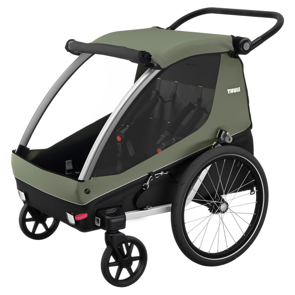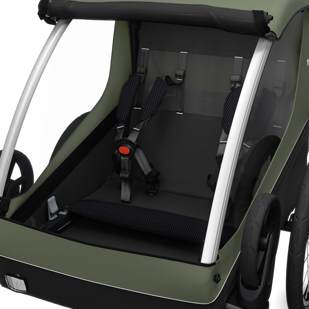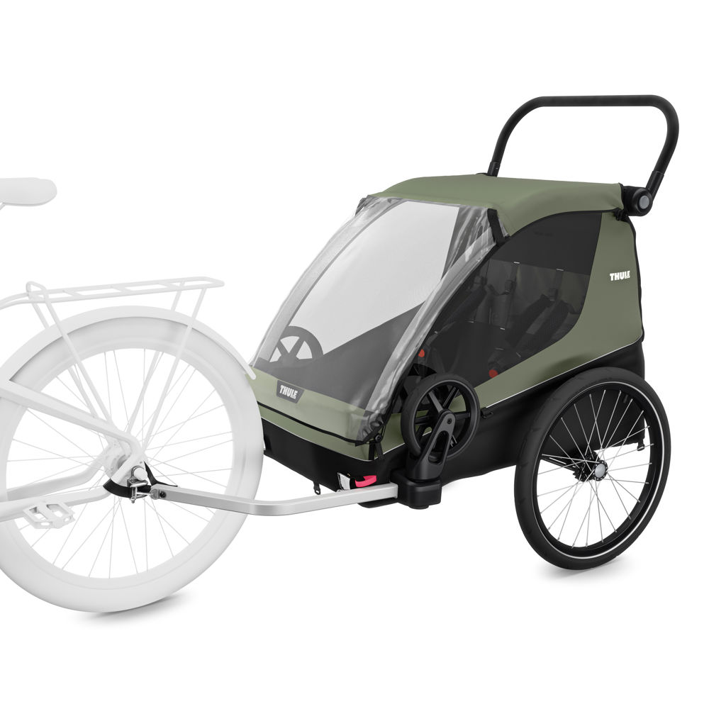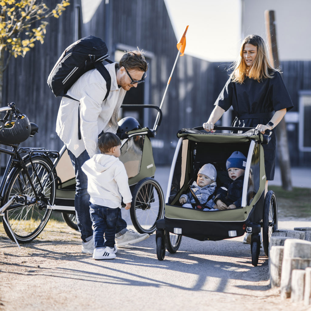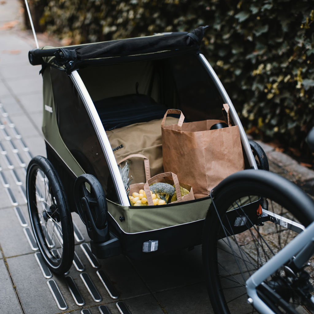Emportez votre famille et vos affaires pour n'importe quelle destination avec Thule Courier – une remorque à vélo sûre et confortable pouvant accueillir jusqu'à deux enfants.