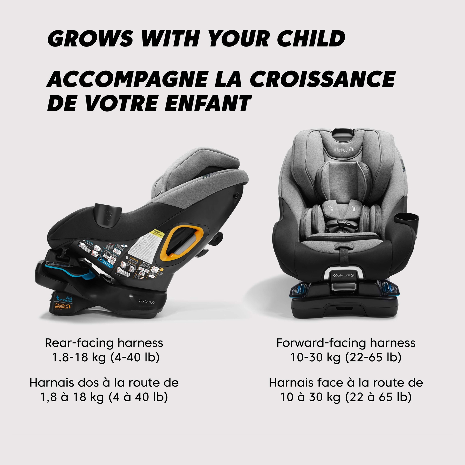 Votre dos vous remerciera. Le siège d´auto convertible accompagne la croissance de votre enfant, passant d´un harnais dos à la route pour les enfants de 1,8 à 18 kg (4 à 40 lb) à un harnais tourné face à la route pour les enfants de 10 à 30 kg (22 à 65 lb).