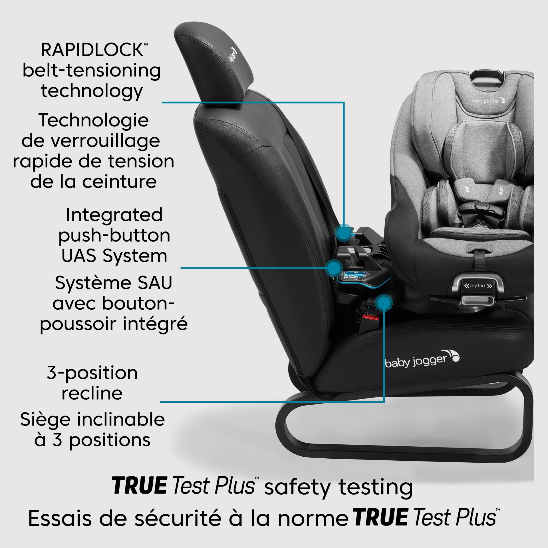 La technologie innovante et sécuritaire permet de le faire pivoter à 180 degrés d´une main, ce qui permet aux parents d´y installer et d´en extraire facilement leur enfant.