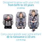Les enfants peuvent voyager face vers l´arrière, de 1.8 à 18.1 kg (4-40 lb); face vers l´avant jusqu´à 29.4 kg (65 lb); et jusqu´à 45.3 kg (100 lb) en mode siège d´appoint. C´est peut-être le seul siège d´auto dont vous aurez besoin.