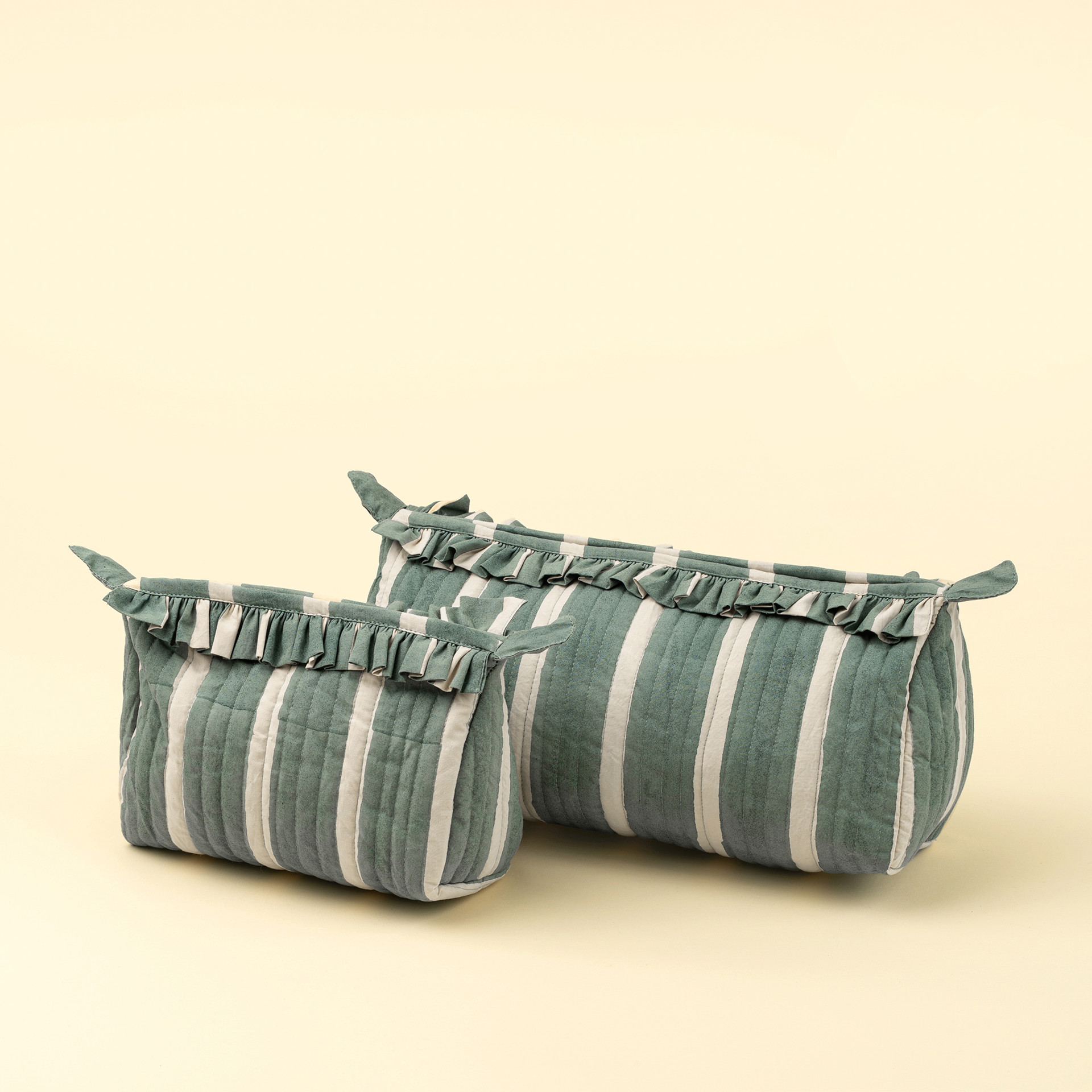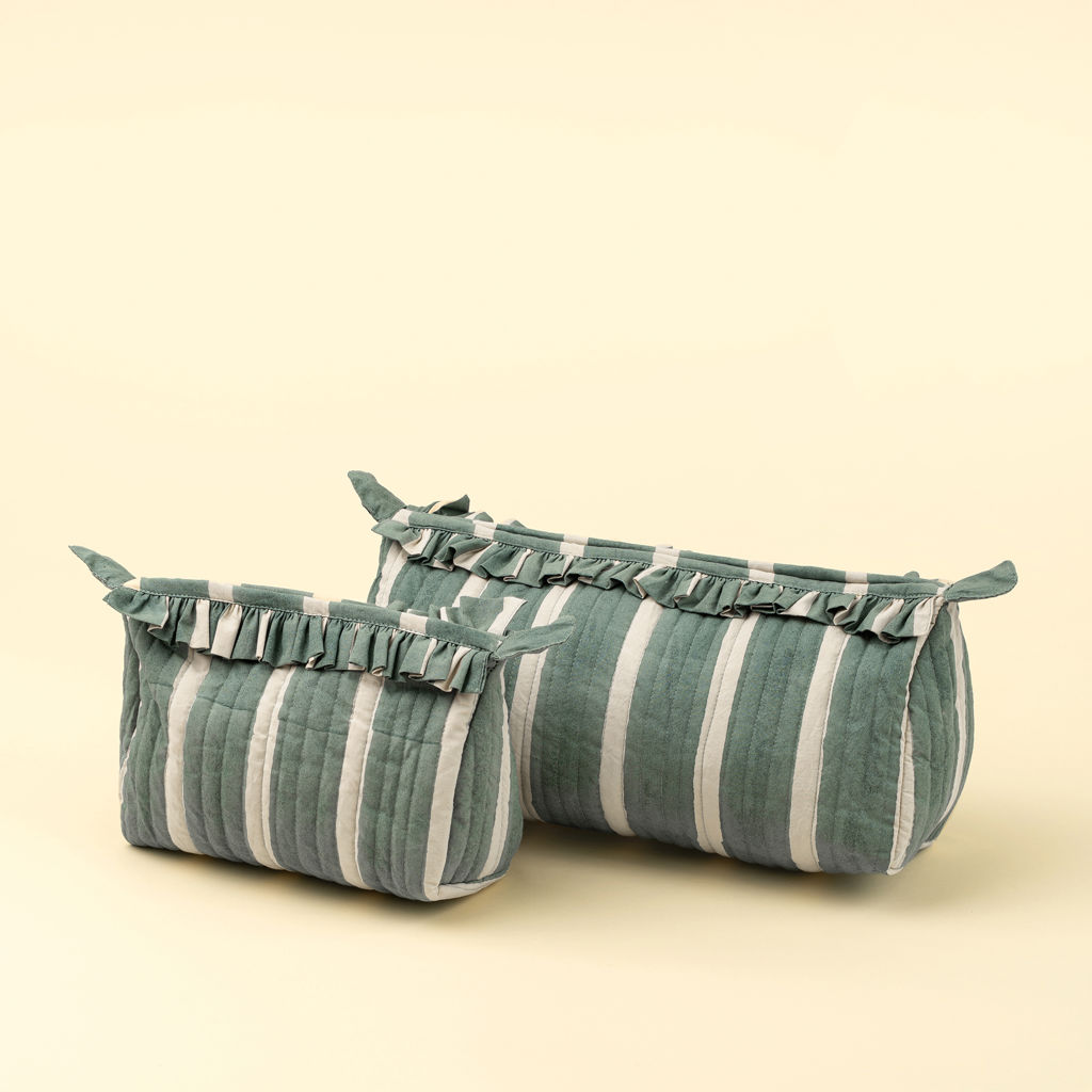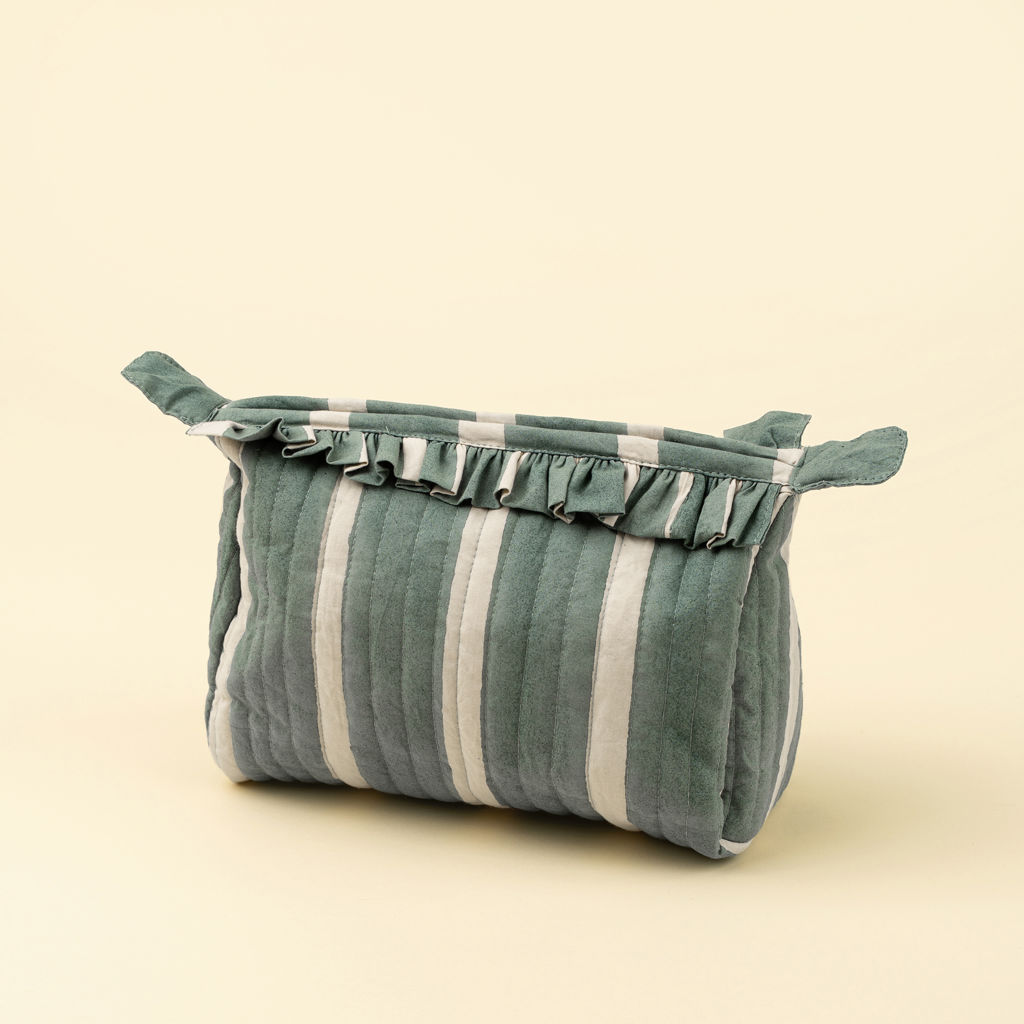 Son motif à rayures audacieux et ses délicats volants en font un accessoire remarquable, parfait à glisser dans un sac ou à porter seul comme pochette décontractée.